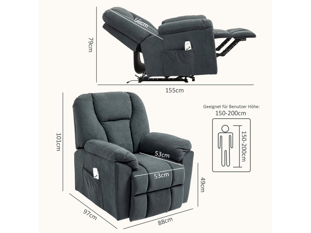 Zažijte maximální pohodlí s polohovacím křeslem HOMCOM s funkcí polohování! Relaxujte dle libosti díky nastavitelnému opěradlu o 135° a výklopné opěrce nohou, které se snadno ovládají dálkovým ovladačem. Osm vibračních masážních bodů na polohovacím křesle cíleně uvolňuje napětí v zádech, bederní oblasti, stehnech a nohou. Integrovaná funkce vyhřívání bederní páteře také poskytuje úlevu za chladných večerů. Pohodlně se opřete a užijte si zasloužený odpočinek.