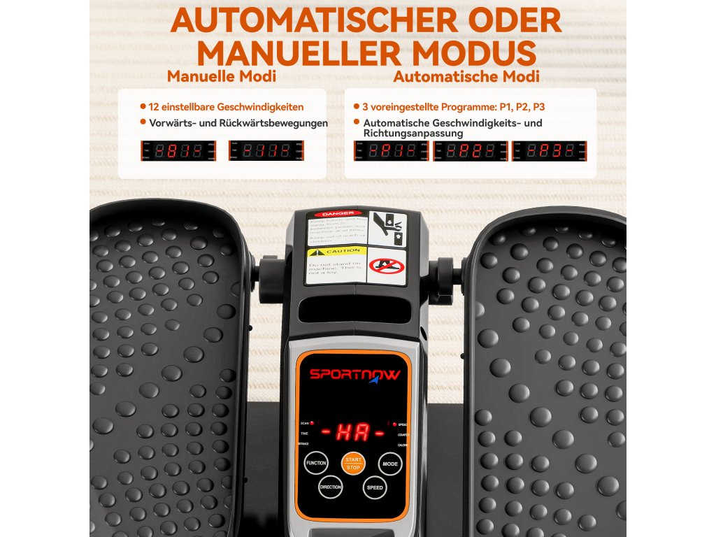 Automatický a manuální tréninkový režim: Tento kompaktní eliptický trenažér je ideální pro individuální tréninkové preference a nabízí manuální (12 nastavitelných úrovní rychlosti) i automatický (P1-P3) režim. Pedály podporují pohyb v obou směrech, čímž aktivují různé svalové skupiny.
