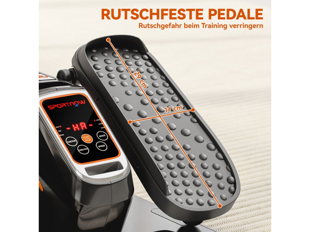Tichý a stabilní trénink: Tento domácí eliptický trenažér umožňuje tichý trénink, poháněný tichým 60W motorem. Texturované, protiskluzové pedály zajišťují stabilní postoj za všech okolností – ideální do kanceláře, pro seniory nebo pro domácí rehabilitaci.