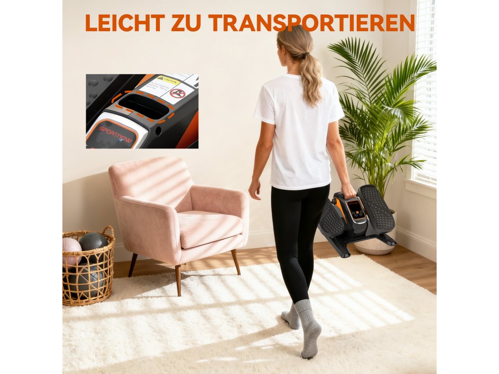 Snadné skladování a přenosnost: Tento lehký mini eliptický trenažér (5,3 kg) lze snadno zasunout pod nábytek a díky integrované rukojeti se snadno přepravuje – ideální pro rychlé tréninky v domácí kanceláři nebo jinde.