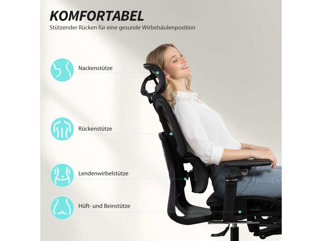 ✔ Podporuje páteř dvouzónovým opěradlem a třístupňovou bederní opěrkou pro úlevu od tlaku