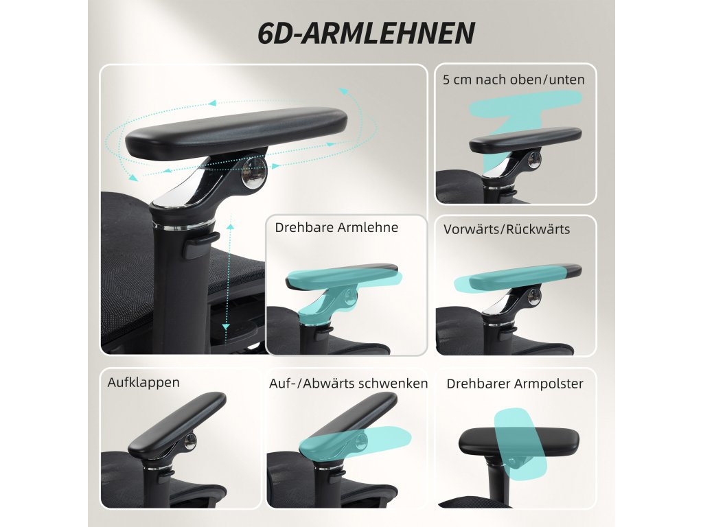 6D područky: Tato kancelářská židle je vybavena plně nastavitelnými područkami – nahoru/dolů (5 cm), dopředu/dozadu, otočnými nahoru/dolů, otočnými područkami nebo sklopnými pro úsporu místa, když se nepoužívají – které podpírají vaše paže a ramena a zároveň vám umožňují maximalizovat váš pracovní prostor.