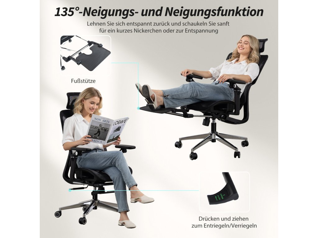 ✔ Sklopení až do 135° s opěrkou nohou pro optimální relaxaci