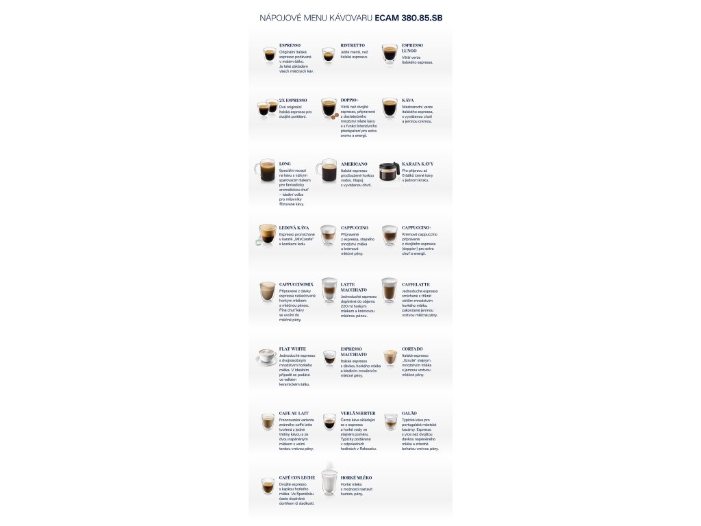 Představte si přístroj, který by vám kdykoliv jako mávnutím kouzelného proutku připravil váš oblíbený kávový nápoj. Tak přesně to umí De'Longhi Dinamica Plus (ECAM380.85.SB) – plnoautomatický kávovar, který nabízí 20 přednastavených receptů, z nichž si to své vybere každý milovník kávy (nechybí zde speciální funkce pro přípravu nápojů, jako je cappuccino, latte macchiato, espresso, ale i speciality jako Verlängerter, Café Con Leche, Café Au Lait a Galao). A kdybyste si náhodou nevybrali, určitě oceníte možnost přípravy klasické kávy na míru s až 4 uživatelskými profily – recepty můžete přizpůsobovat vlastním potřebám nebo vytvářet zcela nové (prostřednictvím přehledného 3,5palcového barevného dotykového TFT displeje). Kávovar pracuje s příkonem 1450 W. |