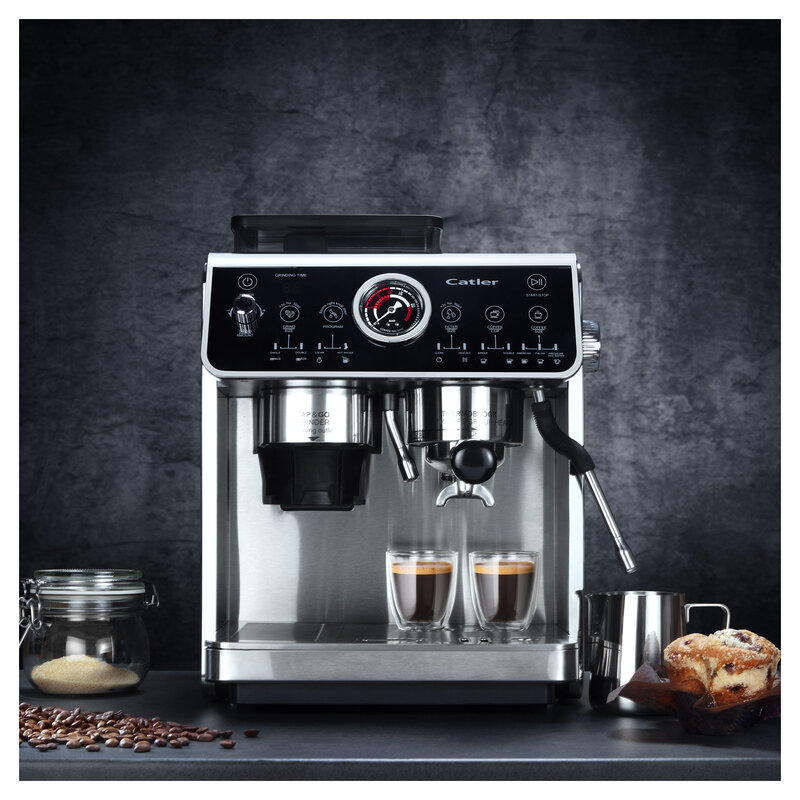 Pákový kávovar Catler ES 910 je navržený pro ty, kdo ocení kvalitu a individualitu nejen ve svém každodenním šálku espressa. Elegantní design kombinuje masivní kov s černým dotykovým LED displejem a překrásně zpracovaným manometrem. Inovativní systém dvojitého čerpadla pracuje s tlakem 20 barů pro kávu a 5 barů pro ohřev a páru.
