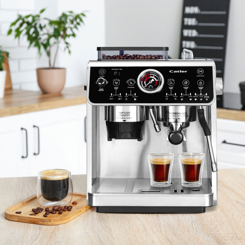 Pákový kávovar Catler ES 910 je navržený pro ty, kdo ocení kvalitu a individualitu nejen ve svém každodenním šálku espressa. Elegantní design kombinuje masivní kov s černým dotykovým LED displejem a překrásně zpracovaným manometrem.