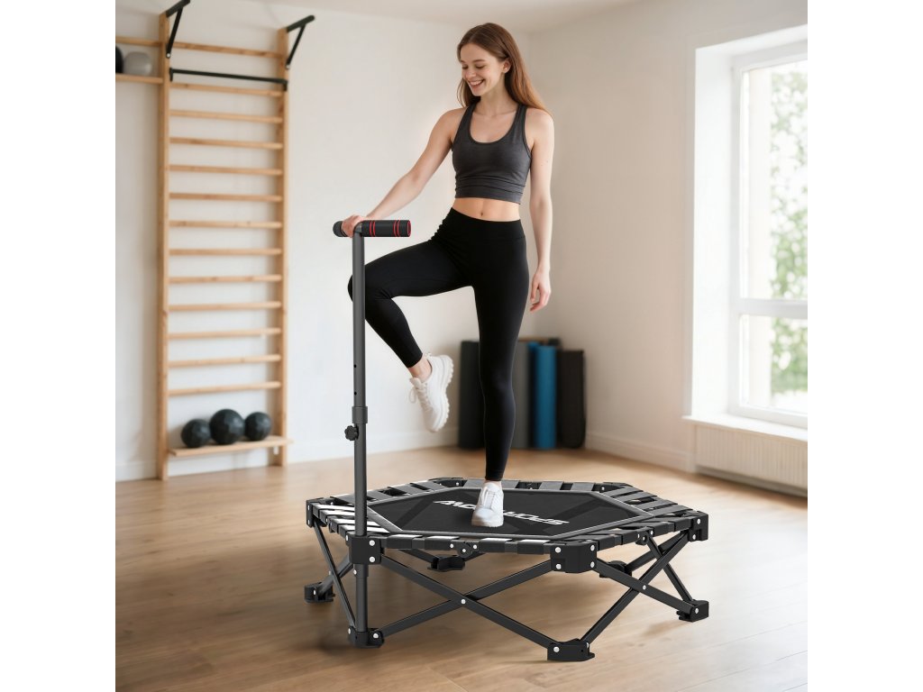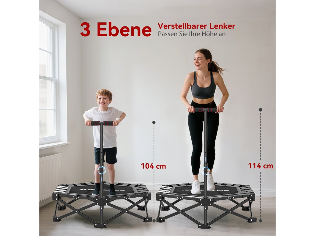 - Nastavitelná rukojeť T-bar: Rukojeť T-bar lze nastavit do tří výšek (104/109/114 cm), aby vyhovovala každému uživateli, což z této fitness trampolíny činí bezpečnou a všestrannou cvičební stanici pro celou rodinu
