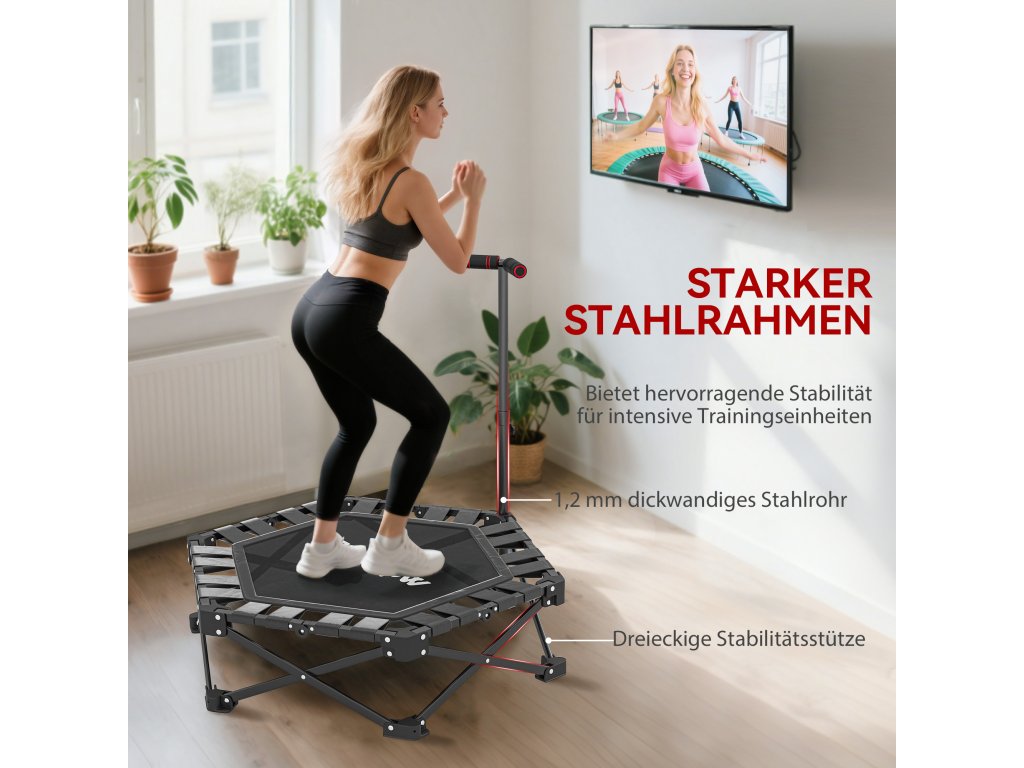 - Pevný ocelový rám: Tato mini trampolína je vyrobena z ocelových trubek o tloušťce 1,2 mm a je vybavena trojúhelníkovou podpěrou stability, která zaručuje vynikající stabilitu pro náročné tréninky umožňující bezpečné skákání