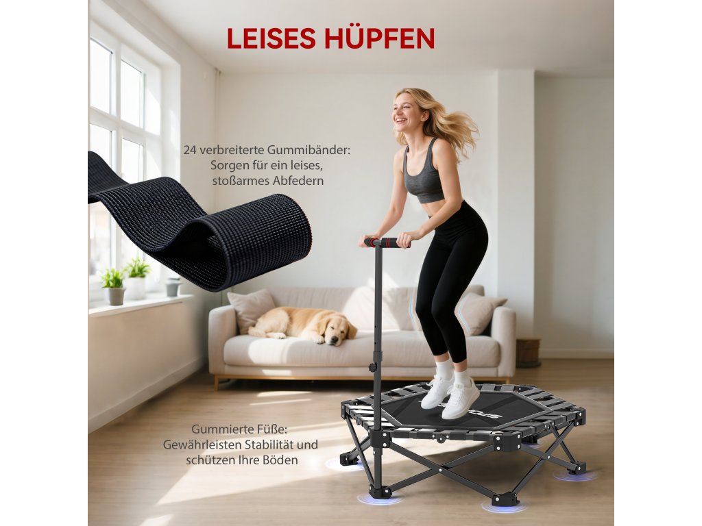 - Tiché skákání a protiskluzové nohy: Tato mini trampolína, vybavená 24 silnými elastickými popruhy a pogumovanými konci nohou, snižuje zátěž kloubů, snižuje hluk, chrání podlahu a udržuje doma ticho