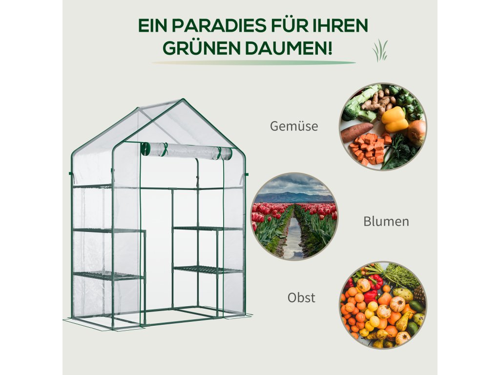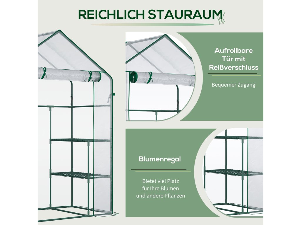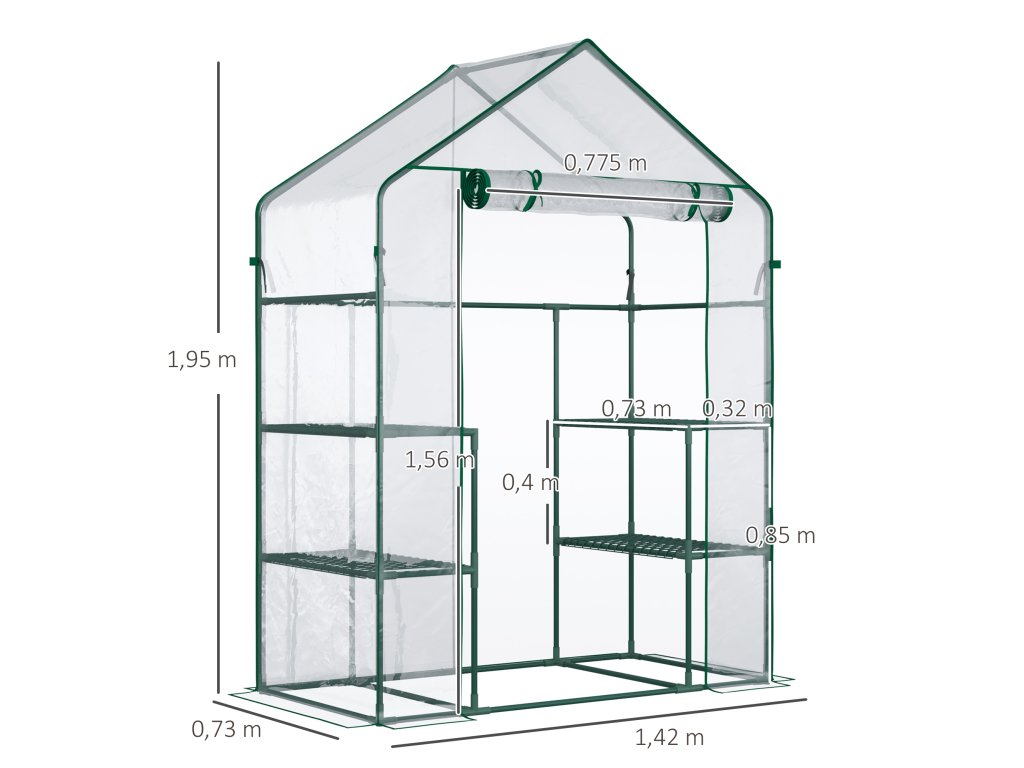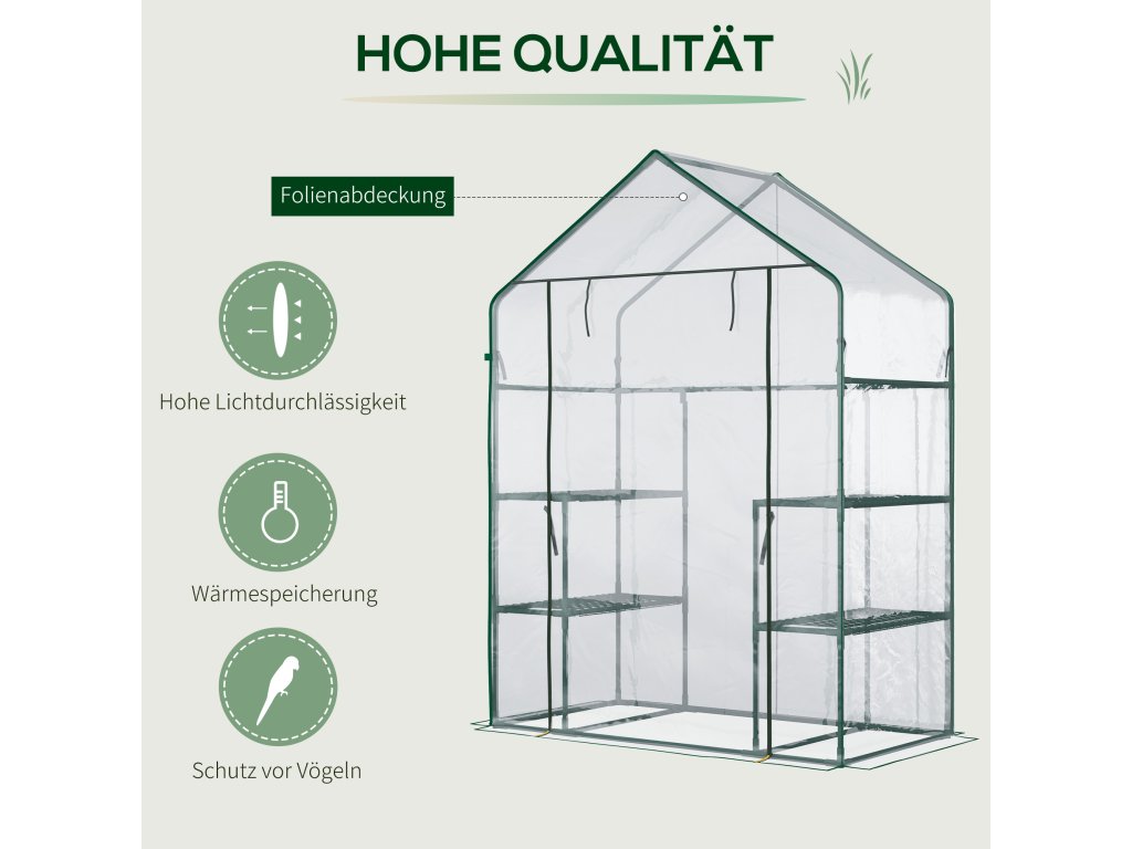 Náš skleník Outsunny se skládá z lehkého, ale pevného PE krytu a ocelového rámu s práškovým nástřikem. Dveře skleníku na zip umožňují snadný přístup a větrání a v případě potřeby je lze uzamknout pro udržení vnitřního klimatu. Díky tomu je skleník ideální pro regulaci teploty a ochranu vašich sazenic před přírodními živly po celý rok.