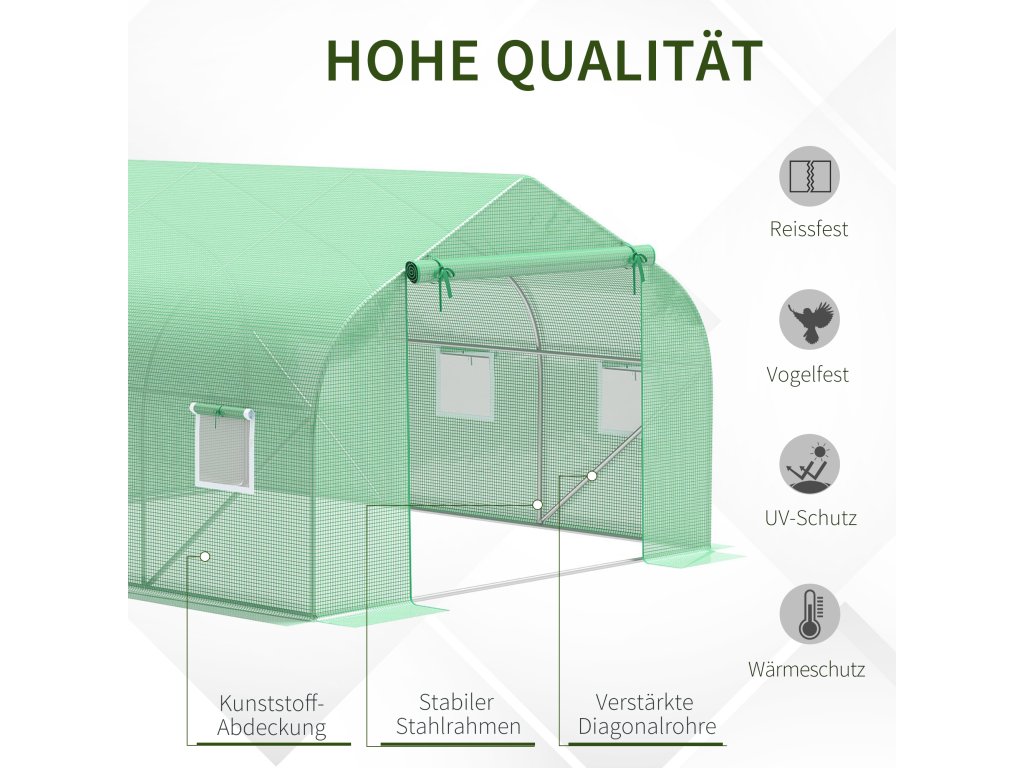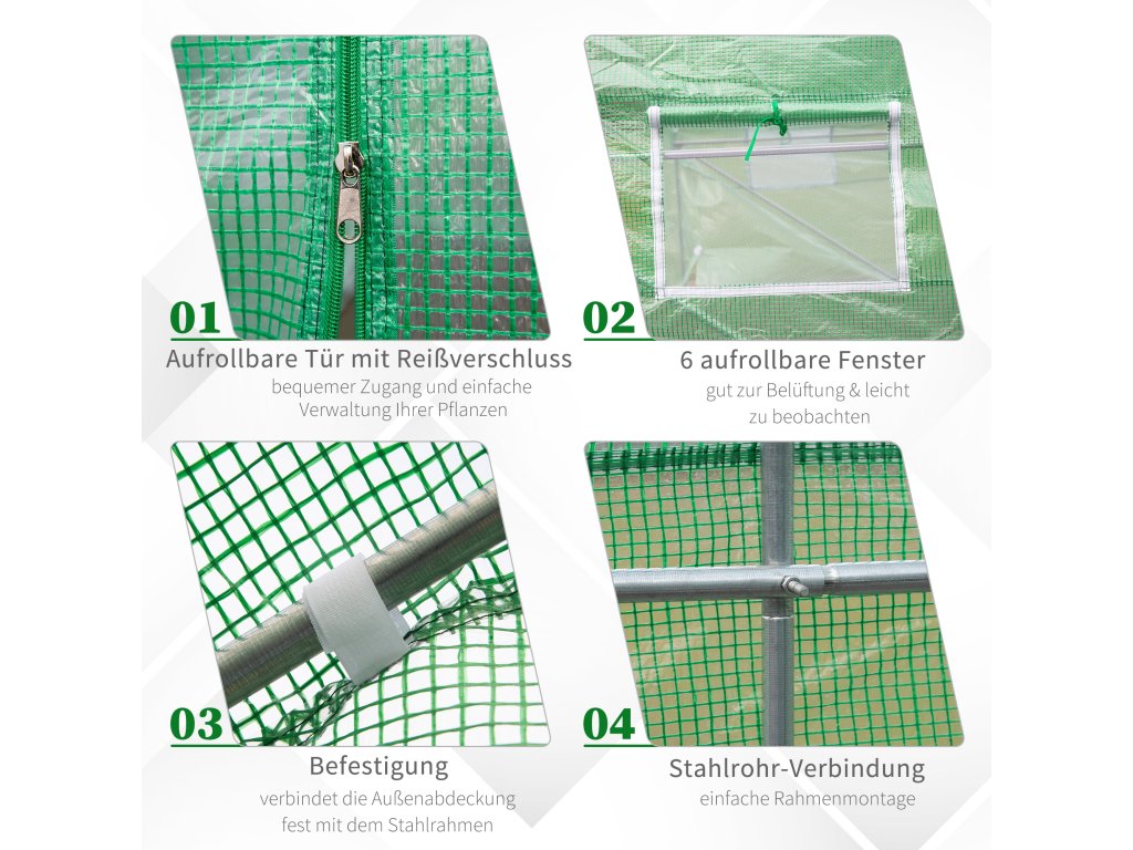 Ocelový rám pro těžký provoz: Vyrobený z odolného ocelového galvanizovaného rámu se silným a robustním designem, odolným vůči korozi, korozi, odlupování a odlupování. Další šikmé podpěrné tyče pro větší stabilitu a stabilnější skleník