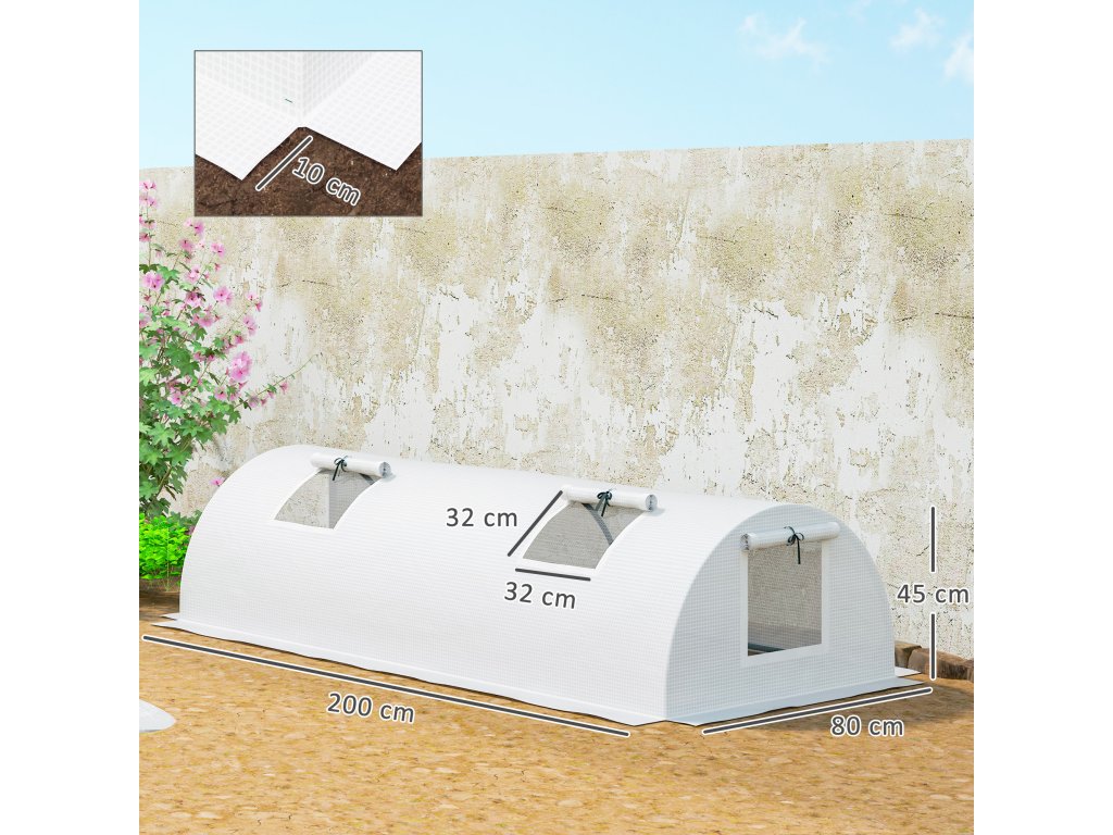 Fóliový skleník Outsunny, mini tunelový skleník s oknem ze síťoviny, odolný proti UV záření, plastová fólie, 200 x 80 x 45 cm, bílý