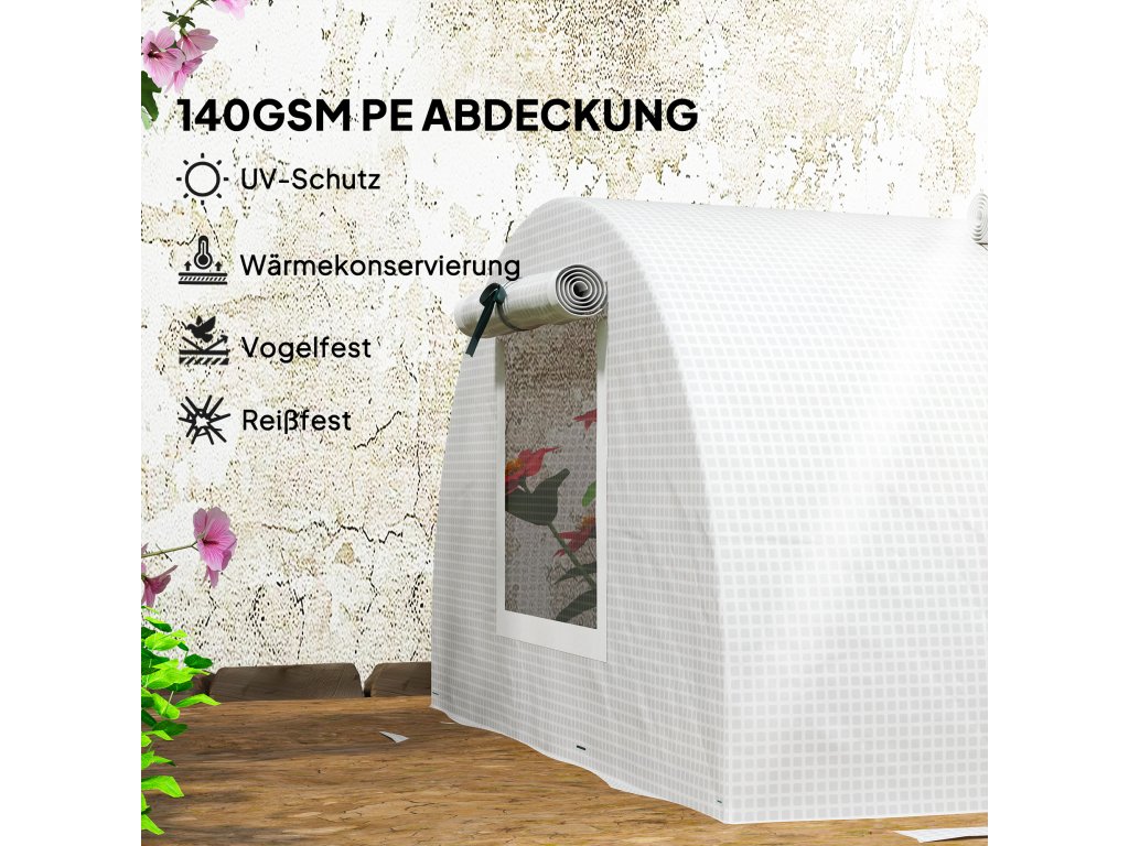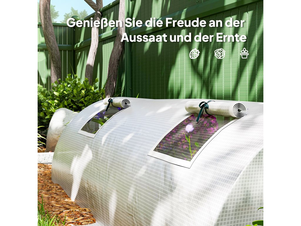 - Vhodné pro venkovní použití: Náš skleník je vybaven klenutou střechou, která umožňuje snadný odtok deště. Rám a rozšířené okraje fólie zaryjte hluboko do země, abyste získali větší stabilitu proti větru a dešti