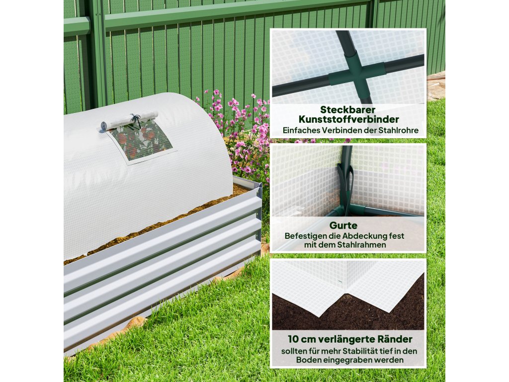- ✔ Zemní trubky a 10 cm prodloužené okraje pomáhají upevnit skleník k zemi