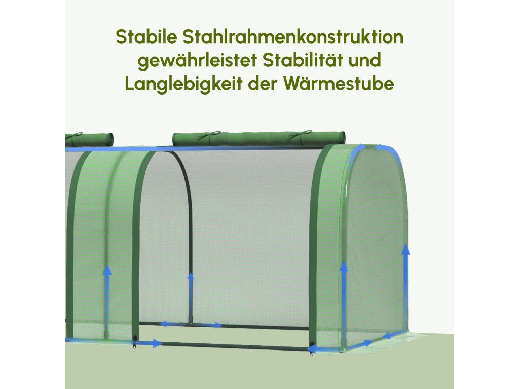 - Robustní a odolná konstrukce: Pevný ocelový rám s práškovým nástřikem je potažen průhlednou plastovou fólií, která chrání vaše rostliny před chladem. Kryt má převislý okraj, který lze zapustit do země, aby se zvýšila stabilita a kryt zůstal pevný.