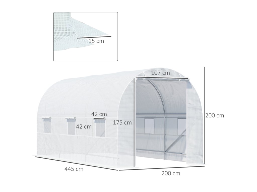 - Celkové rozměry: 445L x 200W x 200H cm; Poznámka: Chcete-li prodloužit životnost skleníku, měli byste jej samostatně zpevnit proti nepříznivému počasí (vítr, déšť, sníh, kroupy atd.). Nepoužívejte prosím kyselé pesticidy, aby nedošlo k chemické reakci se zásaditým PE krytem, která by mohla způsobit poškození.