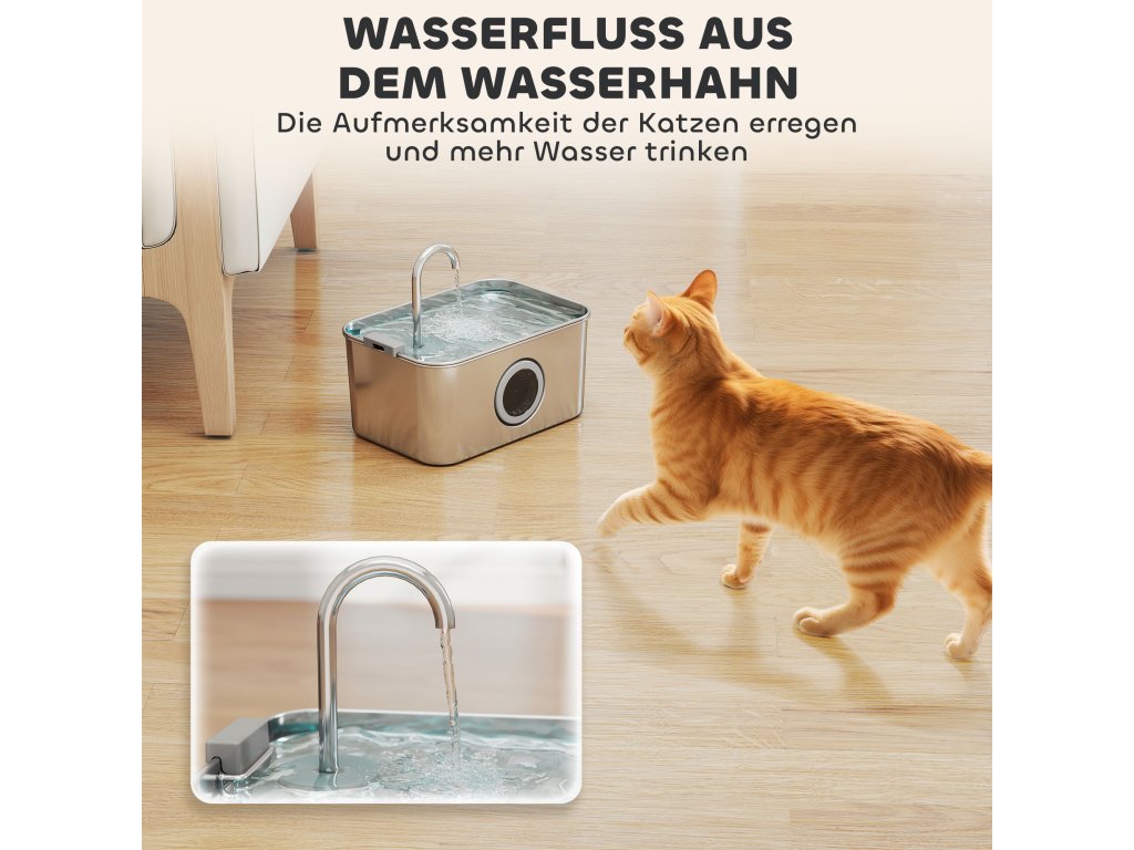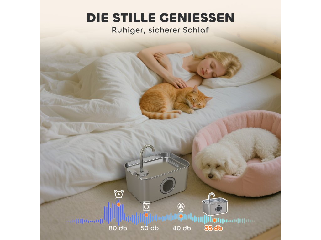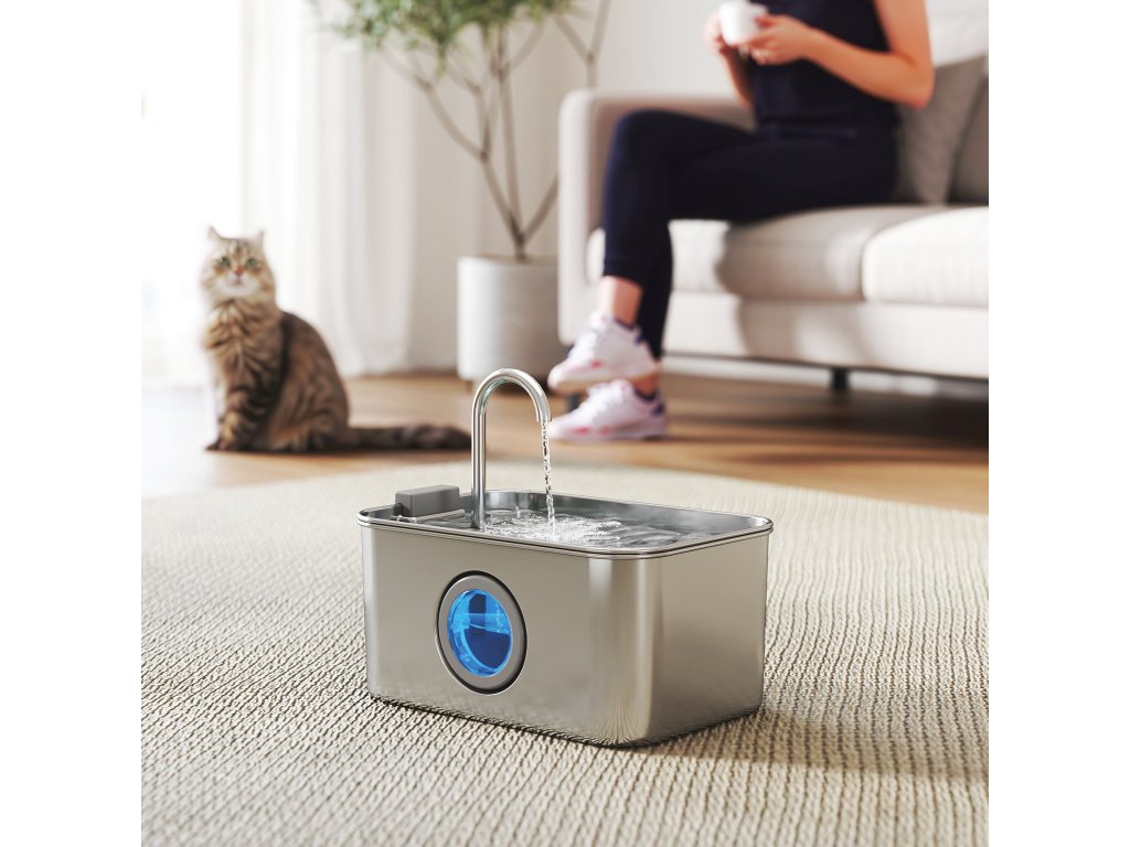 Tichá a viditelná: Tato vodní fontána je vybavena extrémně tichým a energeticky úsporným čerpadlem s hlučností pouhých 35 dB a pracuje tiše jako šepot v knihovně. Průhledné průzor a modré LED světlo usnadňují kontrolu hladiny vody.