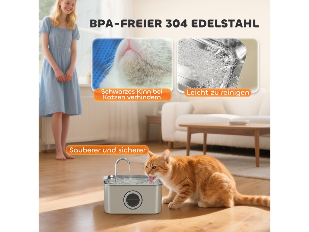 Odolná nerezová ocel: Tato pitná fontána vyrobená z vysoce kvalitní nerezové oceli 304 zajišťuje dlouhou životnost a podporuje zdraví vašeho mazlíčka tím, že zabraňuje růstu bakterií, zejména u koček s akné na bradě nebo citlivou kůží.