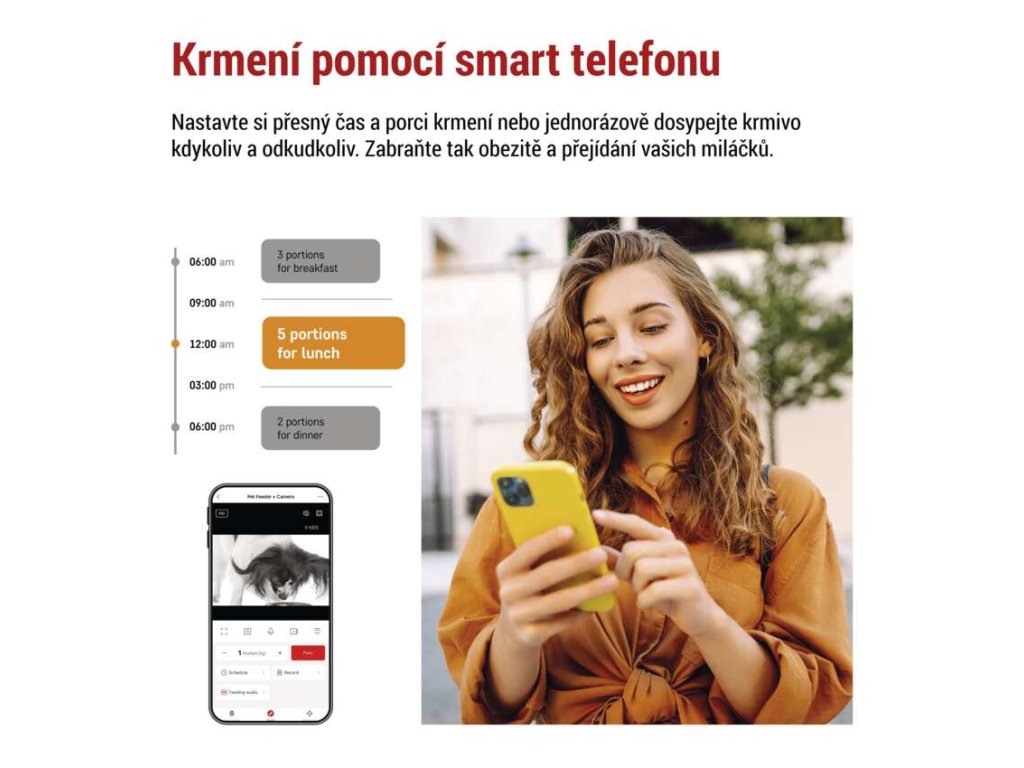 Potřebujete odjet mimo domov nebo vás zdrželi v práci a nestihnete včas nakrmit svého miláčka? Naše chytré krmítko může plně vyřešit vaše problémy s krmením a zajistit čerstvou porci granulí podle přesně nastaveného časového plánu. Díky naklápěcí zabudované kameře (2 MPx) a detekci pohybu budete mít přehled i o tom, jestli vaše kočka nebo pes přišel k misce. Dopřejte svému domácímu mazlíčkovi zdravý a spokojený životní styl.