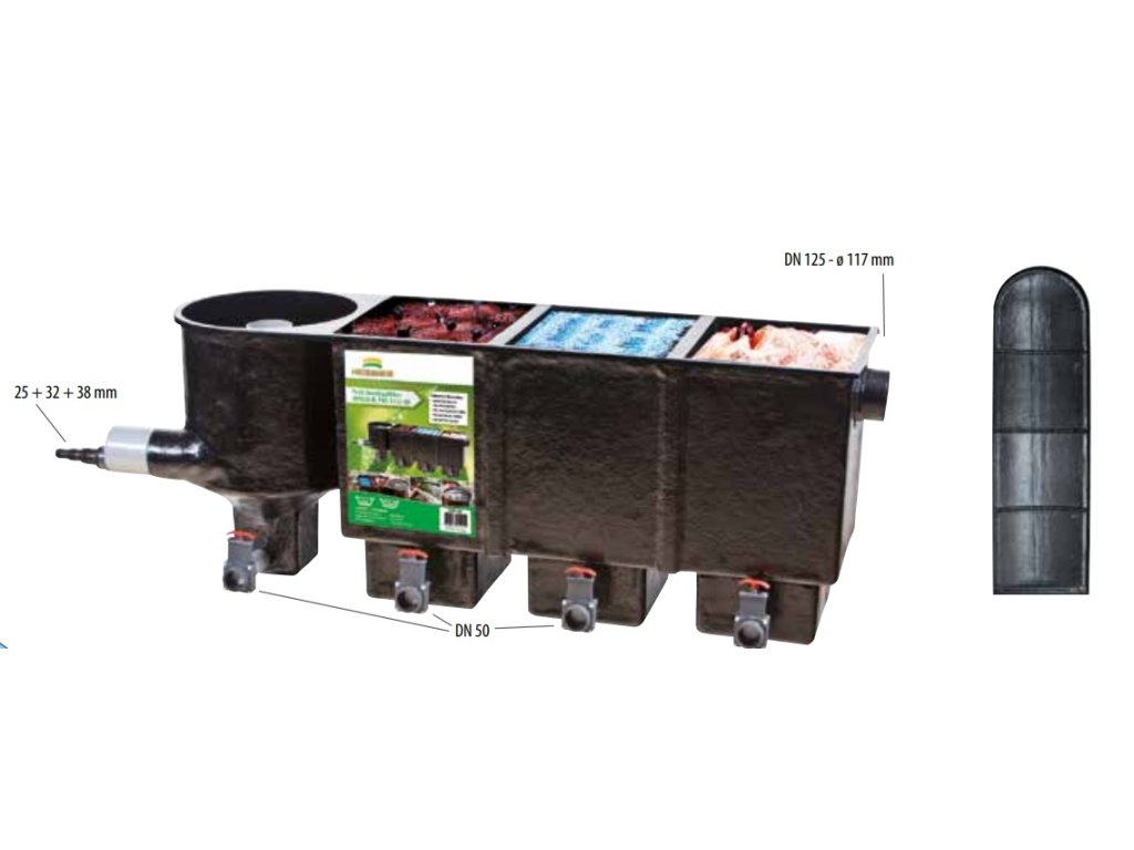 Jezírkový filtrační systém Heissner pro čistou a jasnou vodu ve vašem jezírku. Firma Heissner má více jak 100 let zkušeností s filtračními systémy od tlakových po průtokové a podvodní filtrace. Filtrační systém jednoduše zvolíte dle objemu Vašeho jezírka. Profi průtoková filtrace Heissner F322-00, používá léty osvědčenou konstrukci, velká odstředivka odloučí hrubé i jemné nečistoty. Pak voda pokračuje do dalších komor, které jsou vyspádované a pro snadné čištění má každá svůj vlastní odkalovací ventil. Profi venkovní filtr Apollo může být umístěn vedle jezírka. Je dodáván se všemi filtračními médii a přípojkami. Nejdříve se voda filtruje v první komoře přes odstředivku Vortex, kde se zbaví všech hrubších nečistot před vstupem do biologické části jezírkové filtrace. Nátok vody z jezírka je uprostřed výšky odstředivky a je zaústěn excentricky tak, aby docházelo k rotaci vody. Přepad z odstředivky je v horní části, tak je zaručeno, že nečistoty rotují ve vodě a klesají, dokud se neusadí na dně. Dál voda pokračuje do komory se Sansai kartáči kde dojde k zachycení drobných nečistot. Kartáče jsou vybaveny očky pro snadné vyjmutí. V další části je umístěna filtrační japonská rohož, která slouží jako biologická filtrační plocha pro osídlení filtračních bakterií. V další komoře je speciální filtrační substrát, který se preventivně stará o čistou vodu v zahradním jezírku a podporuje dlouhodobé přirozené čištění vody. Váže škodliviny a přebytečné živiny a bakteriálně je odbourává. K filtraci je dodávány dva přípravky na úpravu vody. Odstraňovač fosfátu 1000 ml, odebere z vody živiny pro řasy. Startovací bakterie k urychlení vzniku biologického samočištění vody .Každá komora filtru je vybavena výpustí pro snadné odkalení.Odkalovací ventily je možné prodloužit za pomocí trubek DN 50 a výpusť do jezírka pomocí DN 125. Tím můžete filtraci umístit dále od jezírka.ParametryPro jezírka bez ryb do objemu 80 m³Pro jezírka s rybami do objemu 40 m³Pro jezírka s koi kapry 20 m³Doporučené čerpadlo HFP7000-00 7 000 l/h / 65 WDoporučená UV lampa F455X-00 55 WFiltrační média Sansai kartáče, japonská filtrační rohož, filtrační substrátOdstraňovač fosfátu 1000 gStartovací bakterie do jezírka 1000 mld x š x v 176 x 46 X 67 cmDoplňkové parametry