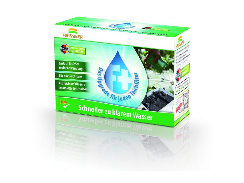 Správná péče o jezírko je nezbytná k tomu, aby se jezírko stalo ideálním stanovištěm pro živočichy a vodní rostliny a vrcholem vaší zahrady. Péče o vodu je zásadní pro zajištění dostatku kyslíku a zachování jezírkového ekosystému. Správně aktivuje a podpoří Váš filtrační systém. Roční sada HEISSNER F-PLUS Jedno balení F+ s 10ti ks sáčky Vám vystačí na celou sezónu /od jara do podzimu/. Jednoduchá aplikace: každé 3 týdny nasypat obsah sáčku přímo do filtru. Obsahuje 7 x přípravek na úpravu vody, ten nastaví správné hodnoty ph a tvrdosti, což je důležité pokud je voda moc měkká nefungují pak filtrační bakterie. Obsahuje 3 x startovací filtrační bakterie, usídlí se ve filtraci a v jezírku odebírají živiny pro řasy. Díky srážkám a vnějším vlivům se mění hodnoty jezírkové vody a mohou mít vliv na kvalitu vody, ale díky sadě HEISSNER F-PLUS přejdete možným problémům. F+ urychluje vznik prospěšných bakterií ve filtru F+ zlepšuje a zvyšuje výkon filtrace F+ zvyšuje tvrdost vody a stabilizuje hodnotu pH F+ doporučován pro všechny filtry pro jezírka o objemu od 2 000 l do 40 000 l Sada obsahuje- 3x startovací bakterie, 7x přípravek na úpravu vody, aplikační plán s kalendářemDoplňkové parametry