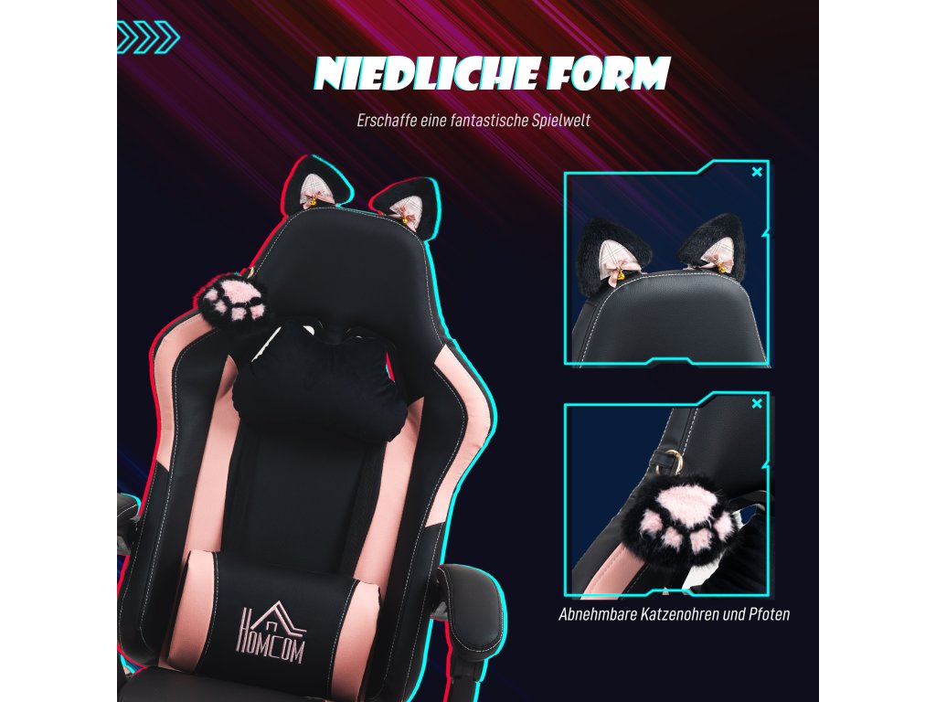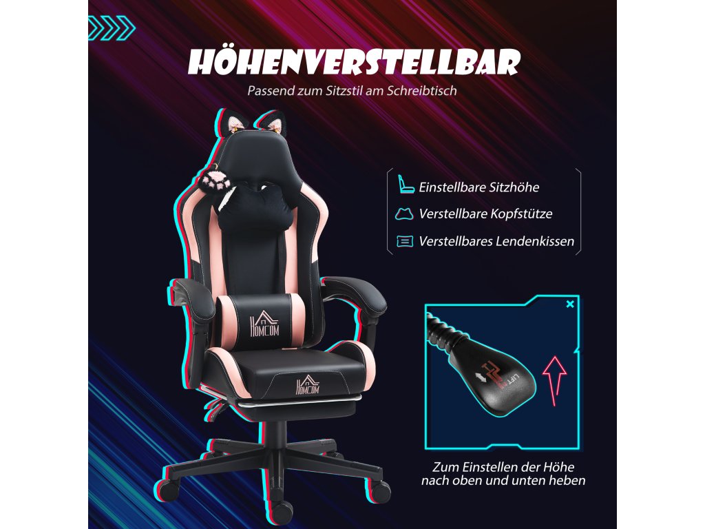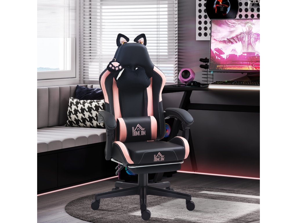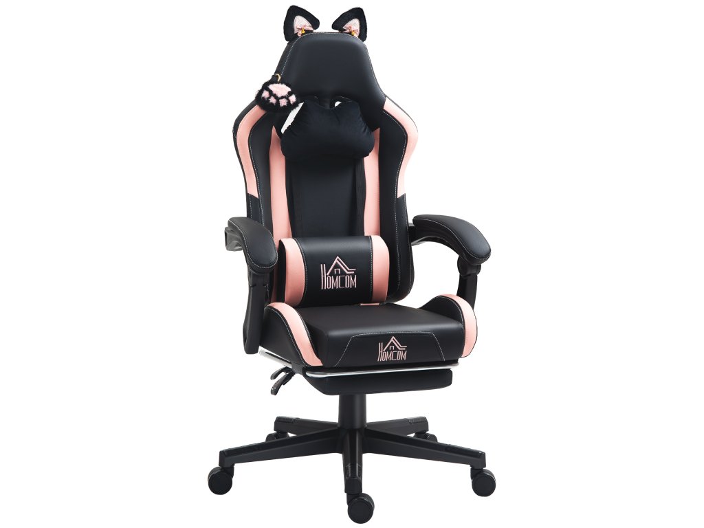 Herní židle HOMCOM s kočičími ušima, polohovací opěradlo, výsuvná opěrka nohou, nosnost až 120 kg, růžová/černá