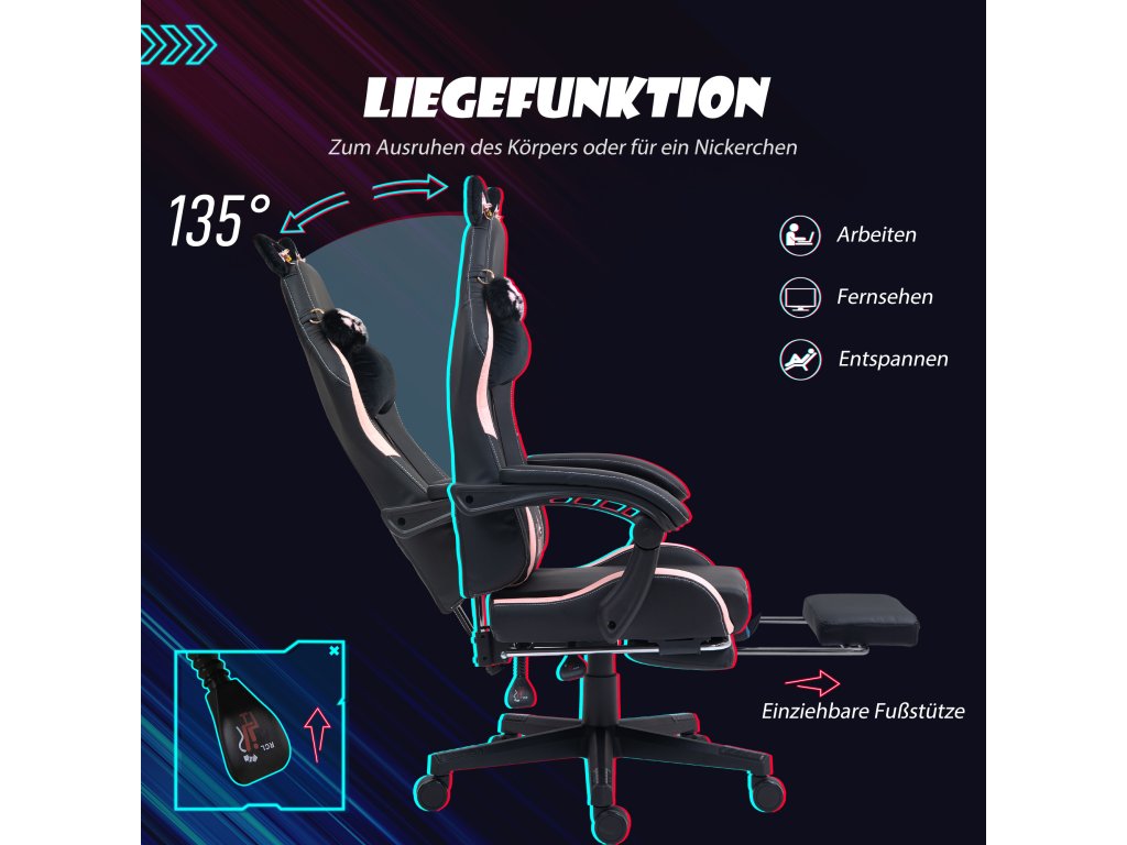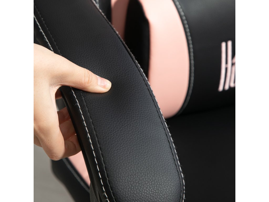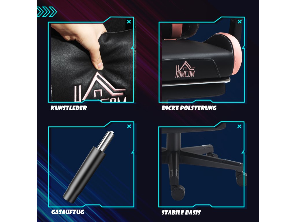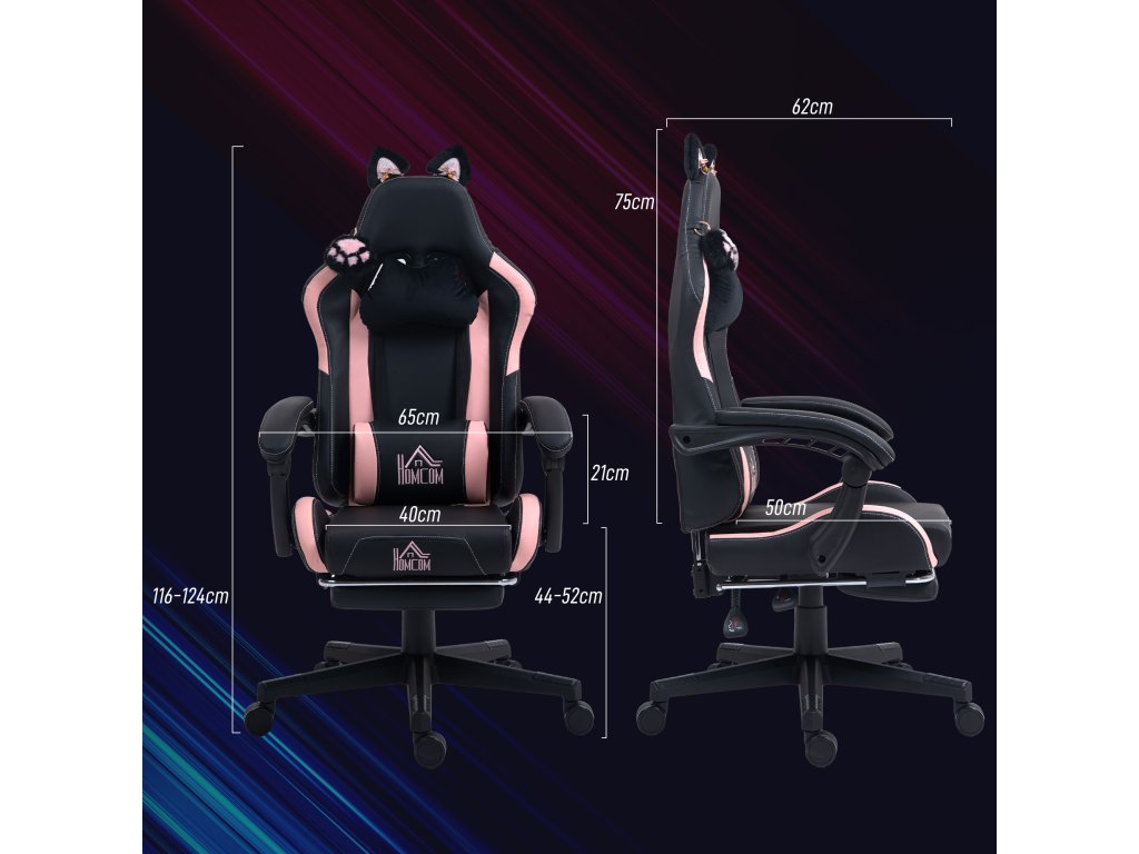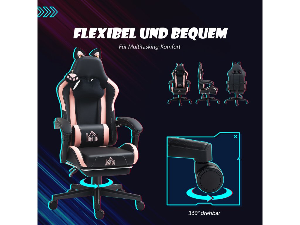 Herní židle HOMCOM s kočičími ušima, polohovací opěradlo, výsuvná opěrka nohou, nosnost až 120 kg, růžová/černá