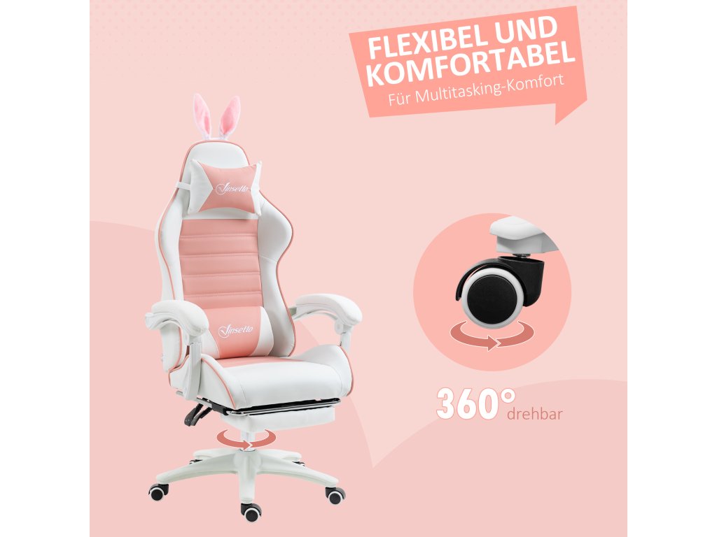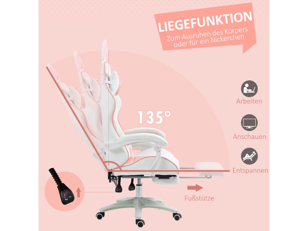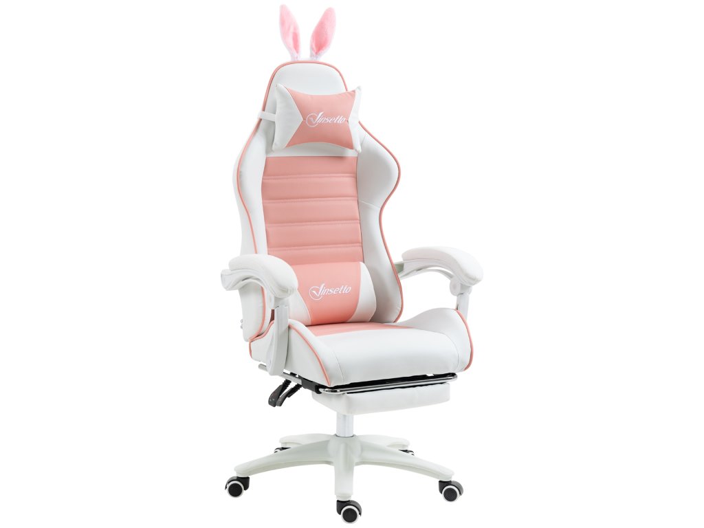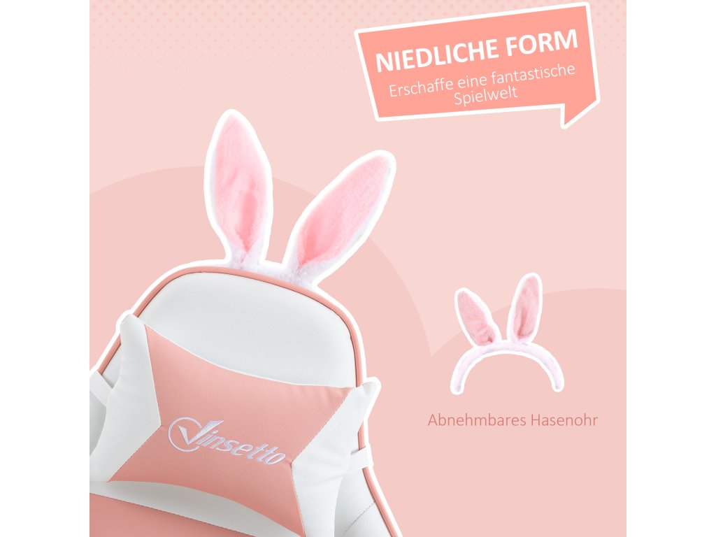 Herní židle Vinsetto Ergonomická herní židle s bederní opěrkou, opěrkou nohou a polštářem s ušima králíka Růžová