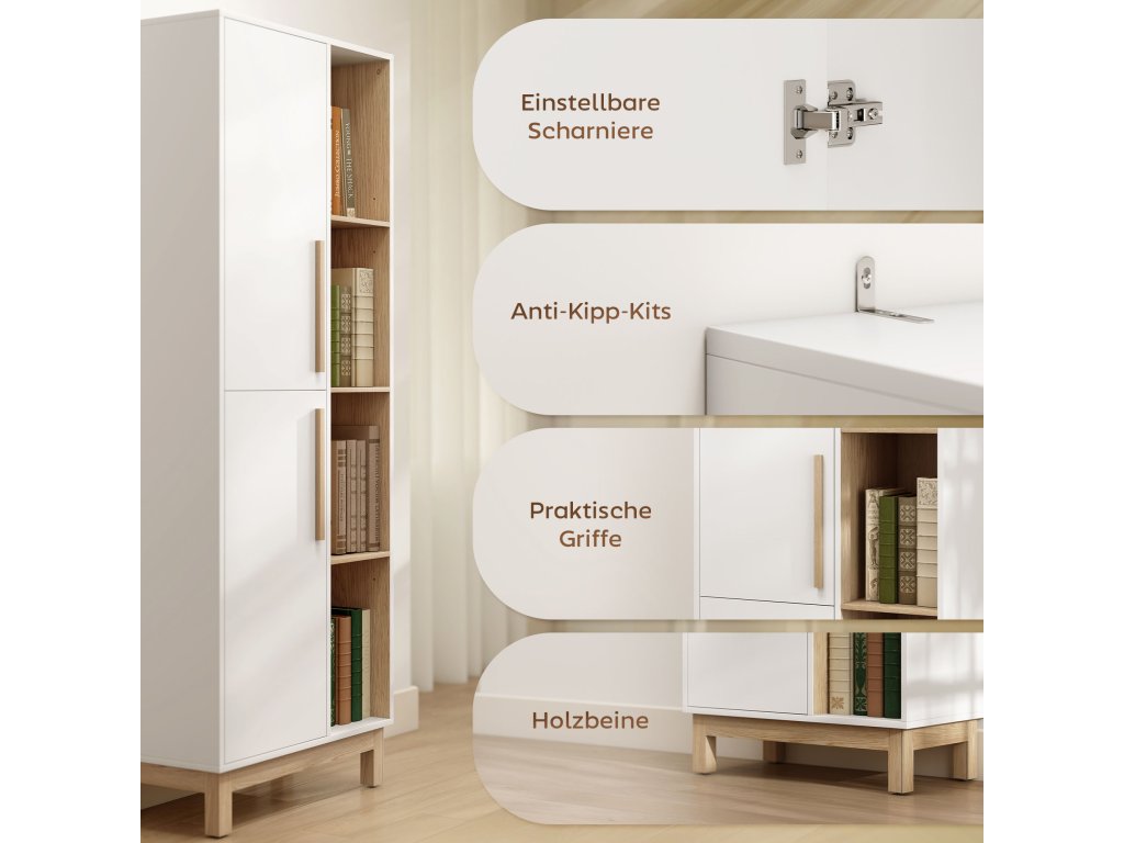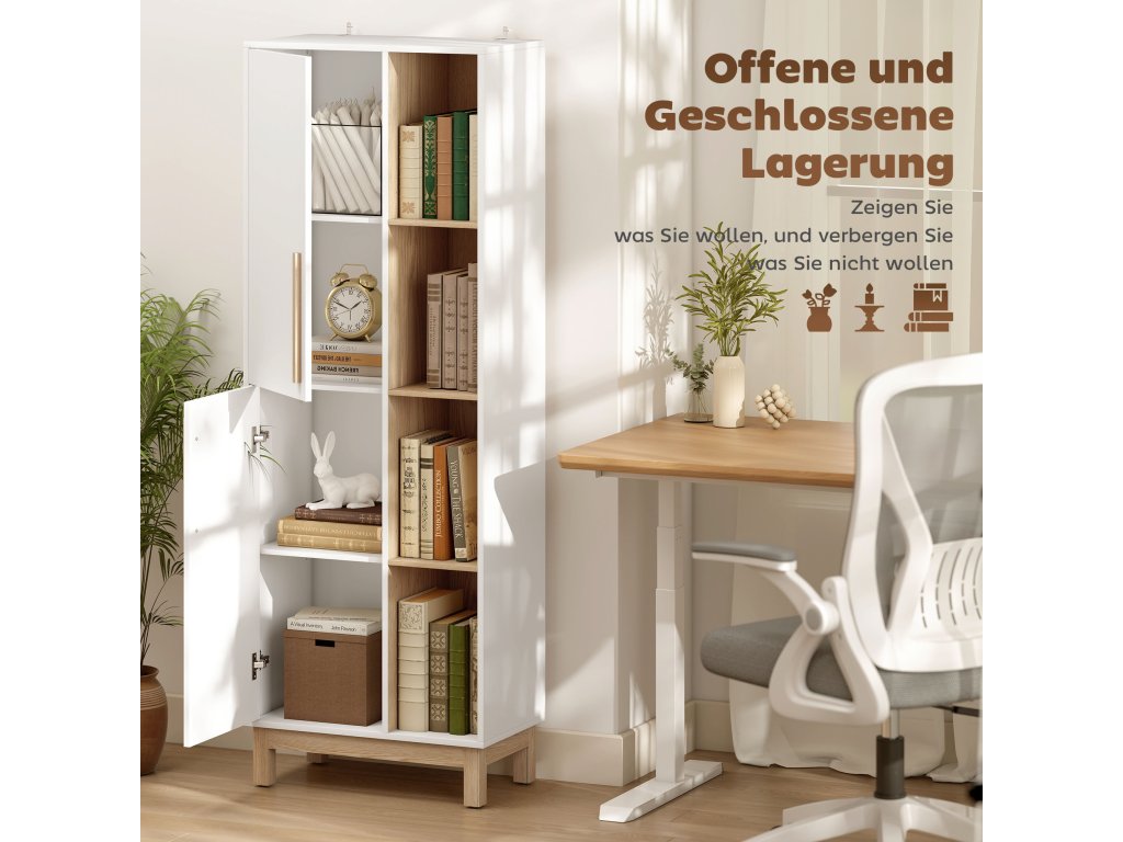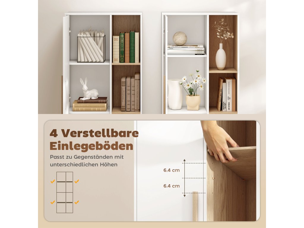 - Flexibilní možnosti uspořádání polic: Tříúrovňové nastavitelné police v otevřené a uzavřené části knihovny lze dokonale přizpůsobit vašim potřebám, ideální pro knihy, rostliny nebo úložné boxy