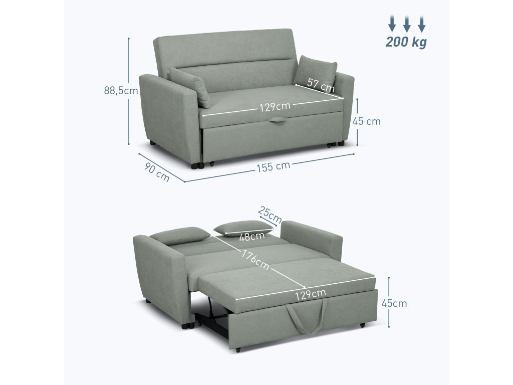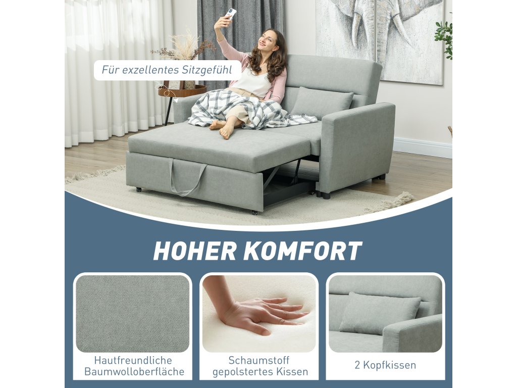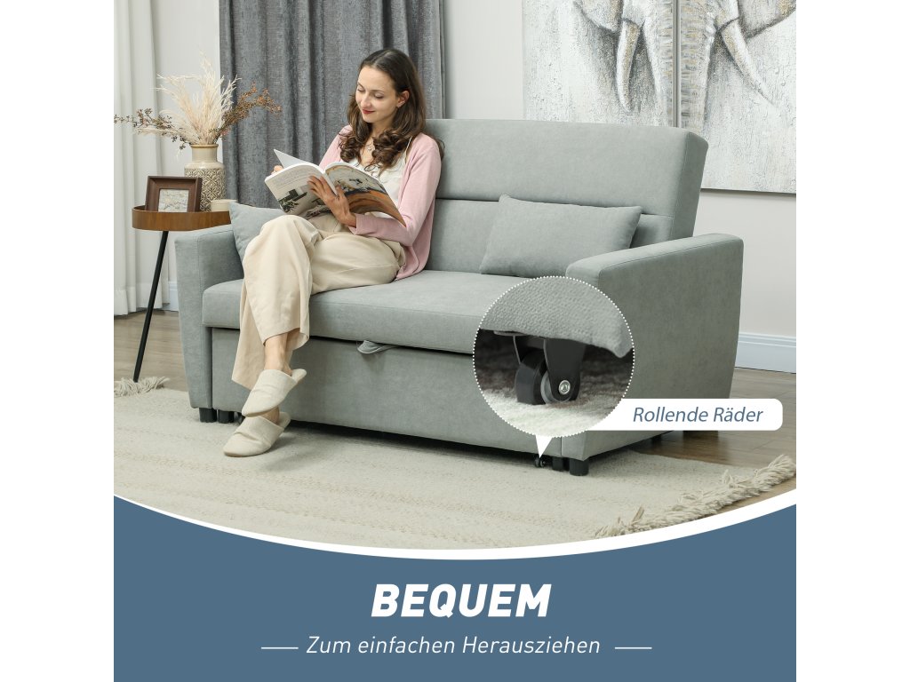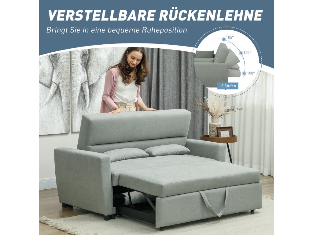 Rozkládací pohovka HOMCOM 2 v 1 vám přes den nabídne elegantní pohovku a v noci pohodlné lůžko pro hosty. Ergonomicky navržená a s třístupňově nastavitelným opěradlem zaručuje optimální pohodlí a podporuje dokonalou relaxaci. Je ideální do obývacího pokoje, ložnice nebo kanceláře a je celoročním společníkem pro chvíle odpočinku. Zažijte dokonalou relaxaci kdykoli a obohaťte svůj domov o tuto multifunkční 2místnou pohovku.