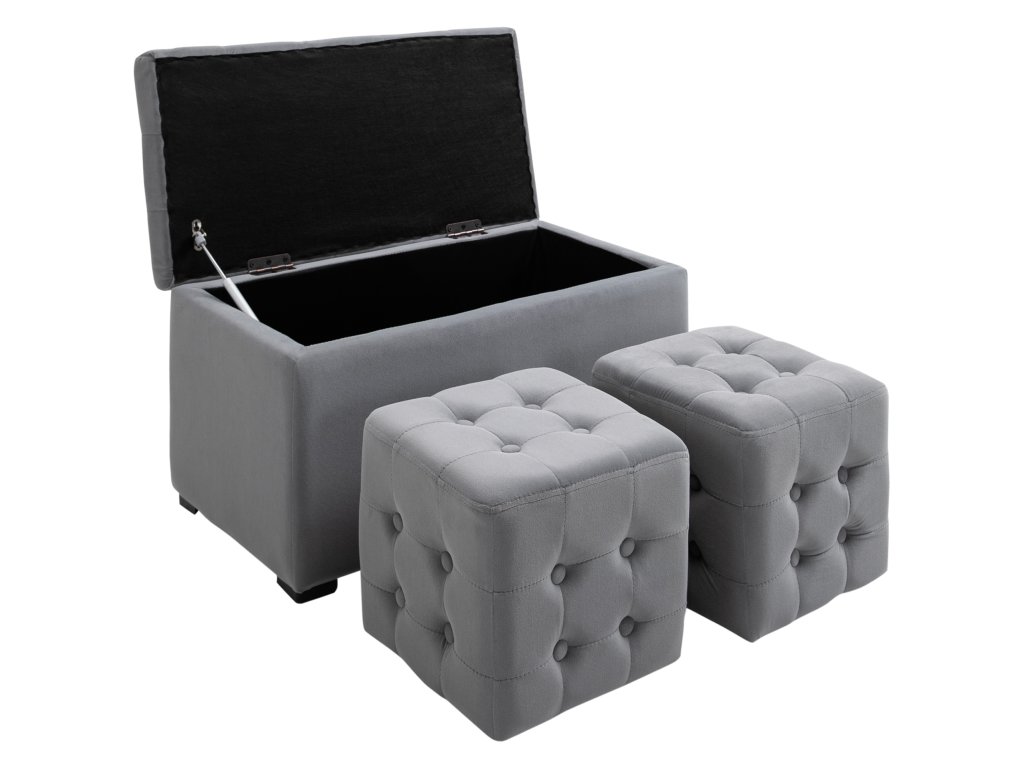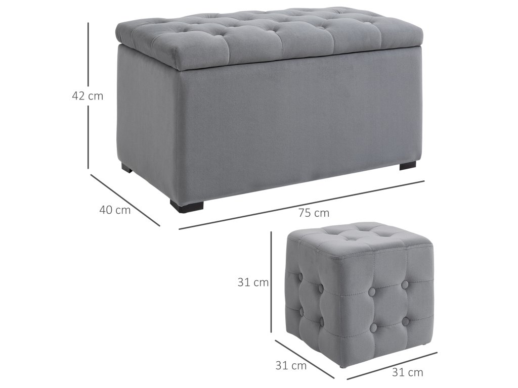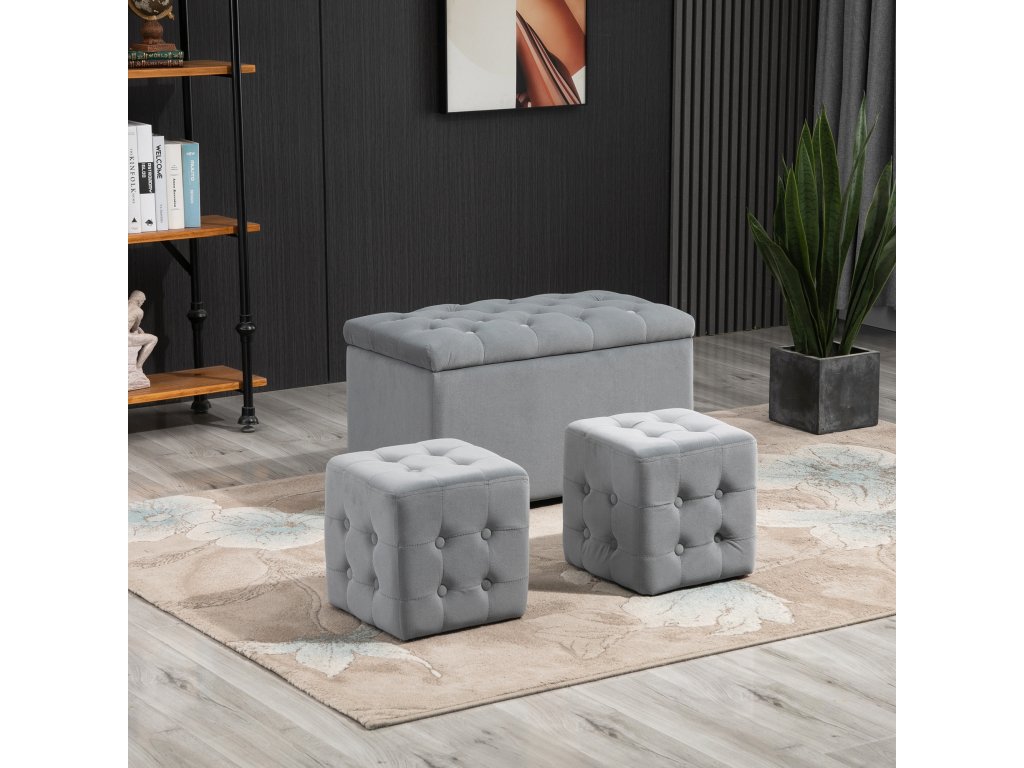 HOMCOM 3dílná souprava s úložným prostorem, 2 x sedací taburet, čalouněná sedací truhla, podnožka, úložný box, podnožka, nosnost do 130 kg, tkanina z mikrovlákna, pěna, 75 x 40 x 42 cm, světle šedá barva
