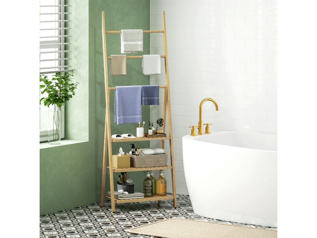 Zlepšete své skladovací schopnosti na jedničku uspořádáním koupelny. Zařaďte tuto koupelnovou poličku HOMCOM do svého interiéru. Tato robustní bambusová jednotka je ideální do vlhkého prostředí. Tato volně stojící koupelnová polička ve tvaru písmene "A" poskytuje stabilitu. Je vybavena třemi stupňovitými přihrádkami a třemi držáky na ručníky, takže usnadňuje ukládání a organizaci. Elegantní doplněk do každé koupelny, která potřebuje více úložného prostoru.
