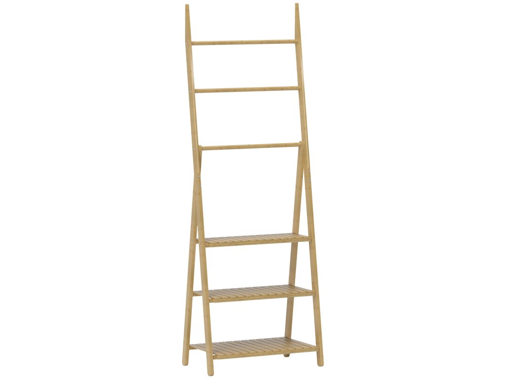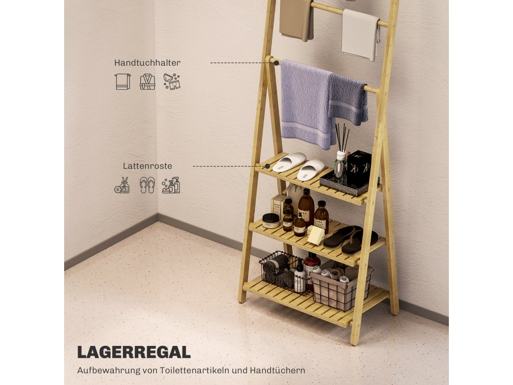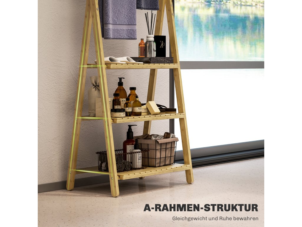 HOMCOM 3patrový koupelnový regál, 3 držáky na ručníky, bambusový rám, tvar A, lamelové police