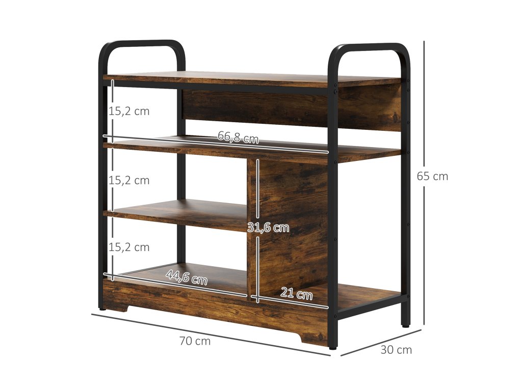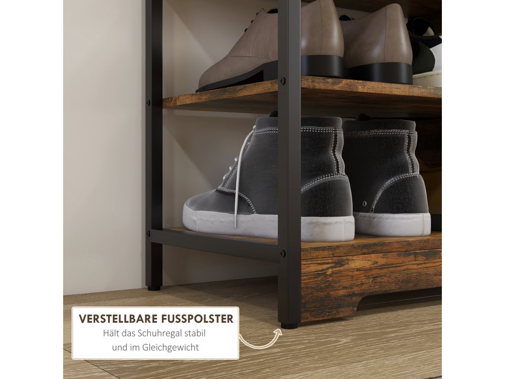 HOMCOM 4-patrový botník, otevřená konstrukce, kovový rám, nastavitelné nožičky, 70x30x65 cm, hnědá/černá barva