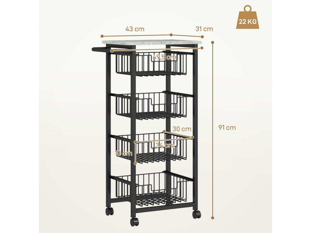 - Informace o kuchyňském vozíku s kolečky: Celkový rozměr: 49,5 Š x 31 H x 91 V cm. Nosnost: 22 kg (celkem), 10 kg (nahoře), 3 kg (na koš). Nutná montáž