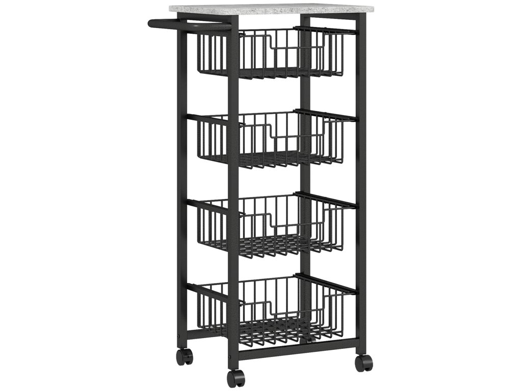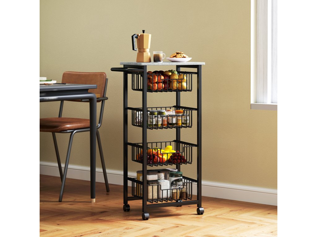 - Praktické skladování: Tento kuchyňský vozík na kolečkách má čtyři výsuvné koše, které jsou ideální pro přehledné uložení zeleniny, ovoce, svačin a sklenic s kořením