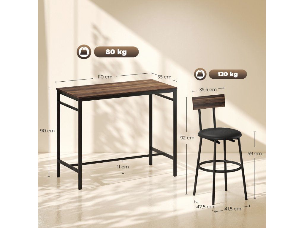 Odolná konstrukce: Vysoký stůl je vyroben z tlustých panelů a robustních ocelových trubek a unese až 80 kg, každá barová židle až 130 kg. Protiskluzové opěrky nohou zvyšují stabilitu a chrání podlahu před poškrábáním.