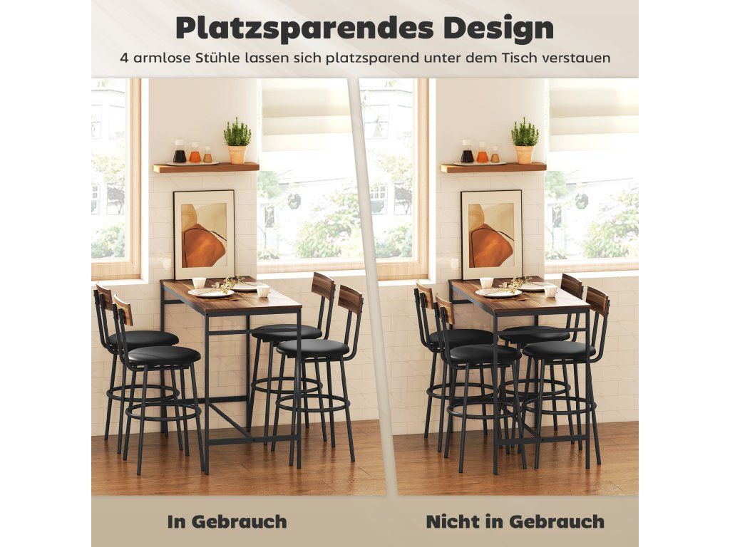 Úspora místa v malých prostorách: Tato 5dílná sada barových stolů je ideální do kuchyní, jídelen nebo malých studií. Pokud se nepoužívá, lze čtyři stoličky kompletně zasunout pod stůl, čímž se ušetří místo a vytvoří se příjemná atmosféra.