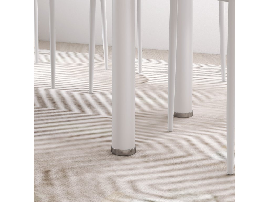 - Robustní konstrukce: Kuchyňský stůl se skládá z robustní desky z tvrzeného skla. Snadno udržovatelné a čistitelné židle mají ocelové nohy s práškovým nástřikem a elegantní potah z umělé kůže. Protiskluzové nožky navíc zajišťují, že nedojde k poškrábání podlahy