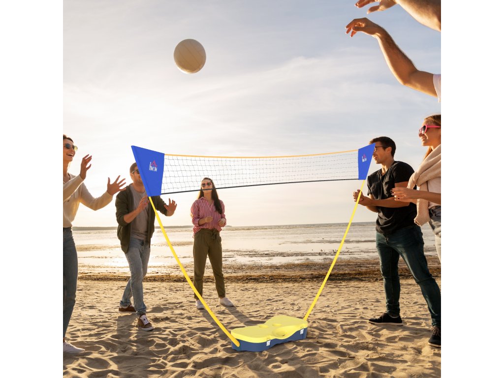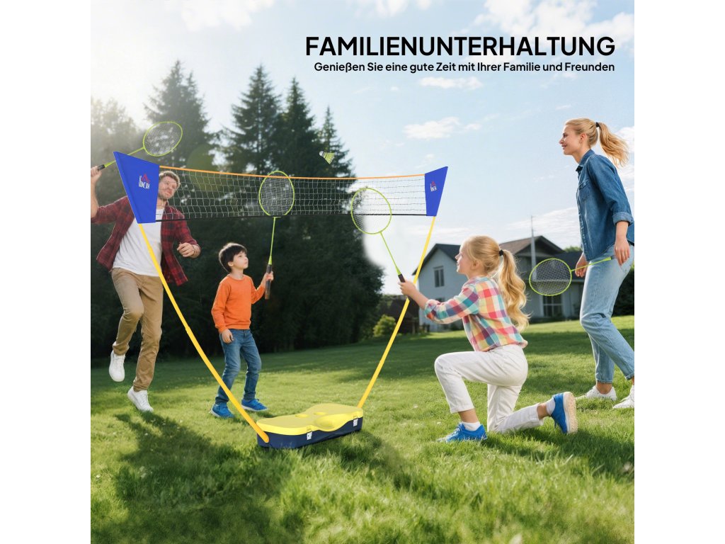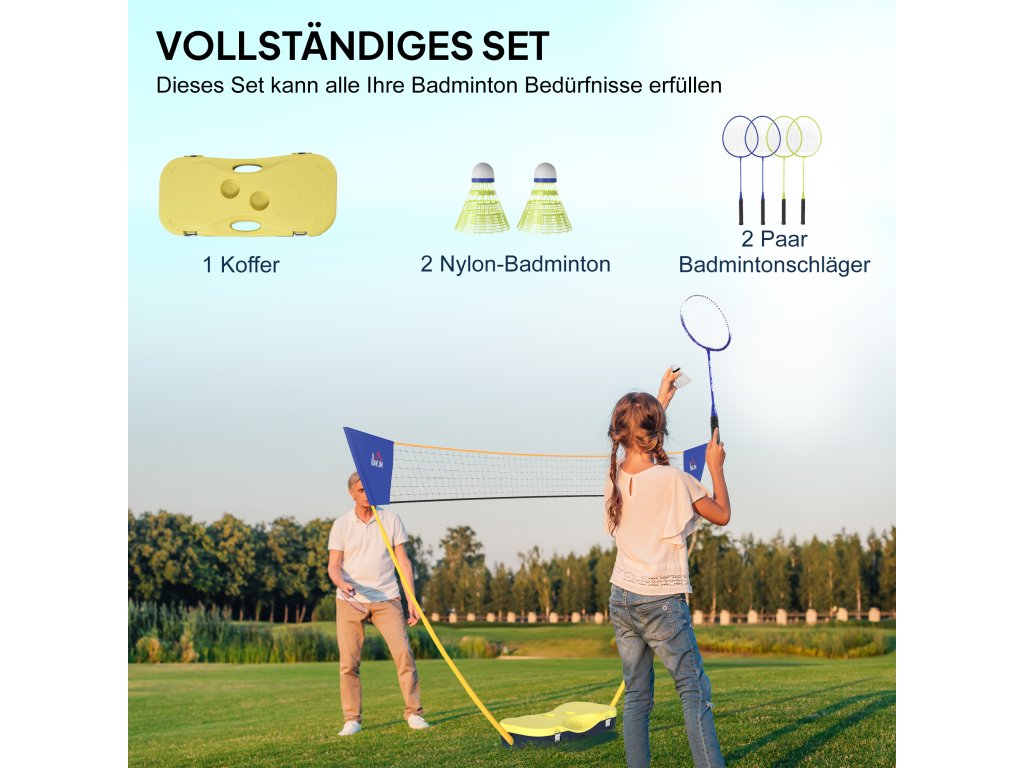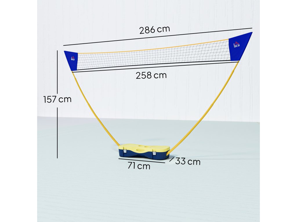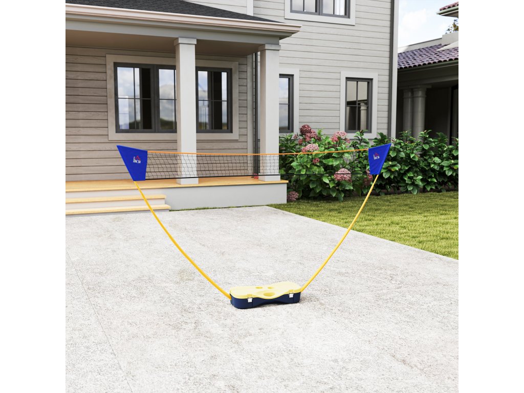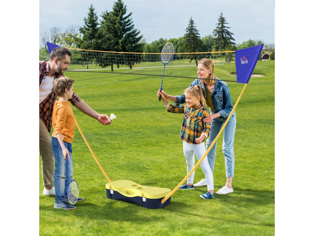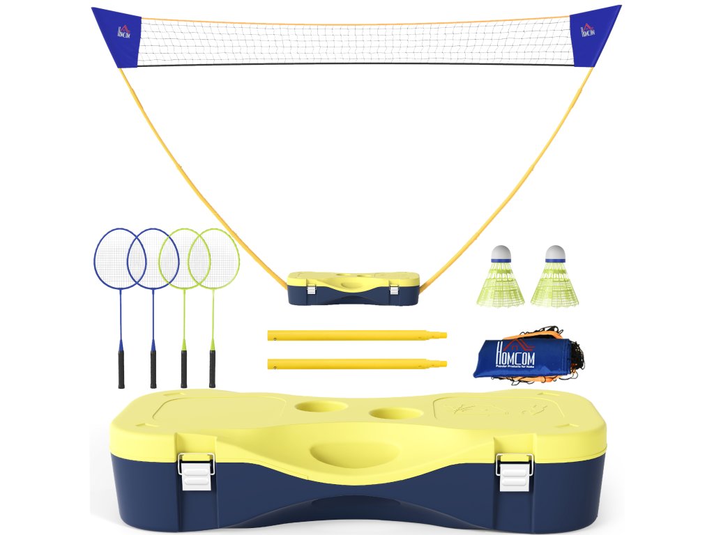HOMCOM Badmintonová síť se stojanem, stojan na badmintonovou síť, přenosný stojan na síť, badmintonová síť se 4 badmintonovými raketami, venkovní sport, žlutá+modrá, 286 x 33 x 157 cm