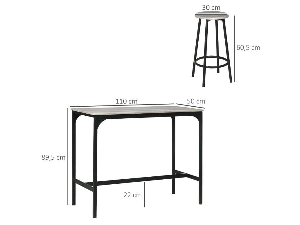 - Informace o barovém stole a barové židli: Stůl: 110L x 50W x 89,5V cm. Stolička: Ø30 x 60,5V cm. Nosnost: 50 kg (stůl), 120 kg (stolička). Nutná montáž.