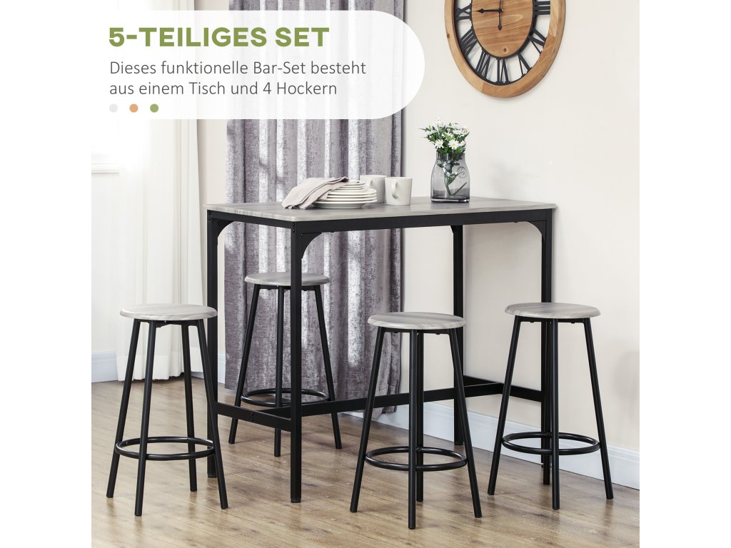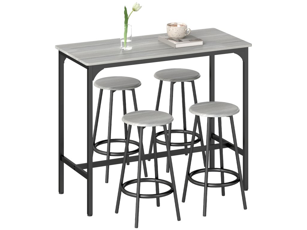 - pětidílná sada barových stolů: Tato sada barových stolů pro 4 osoby se skládá z malého barového stolu a čtyř odpovídajících barových stoliček. S touto sadou barových stolů si můžete vychutnat snídani, oběd i večeři společně s rodinou a přáteli.