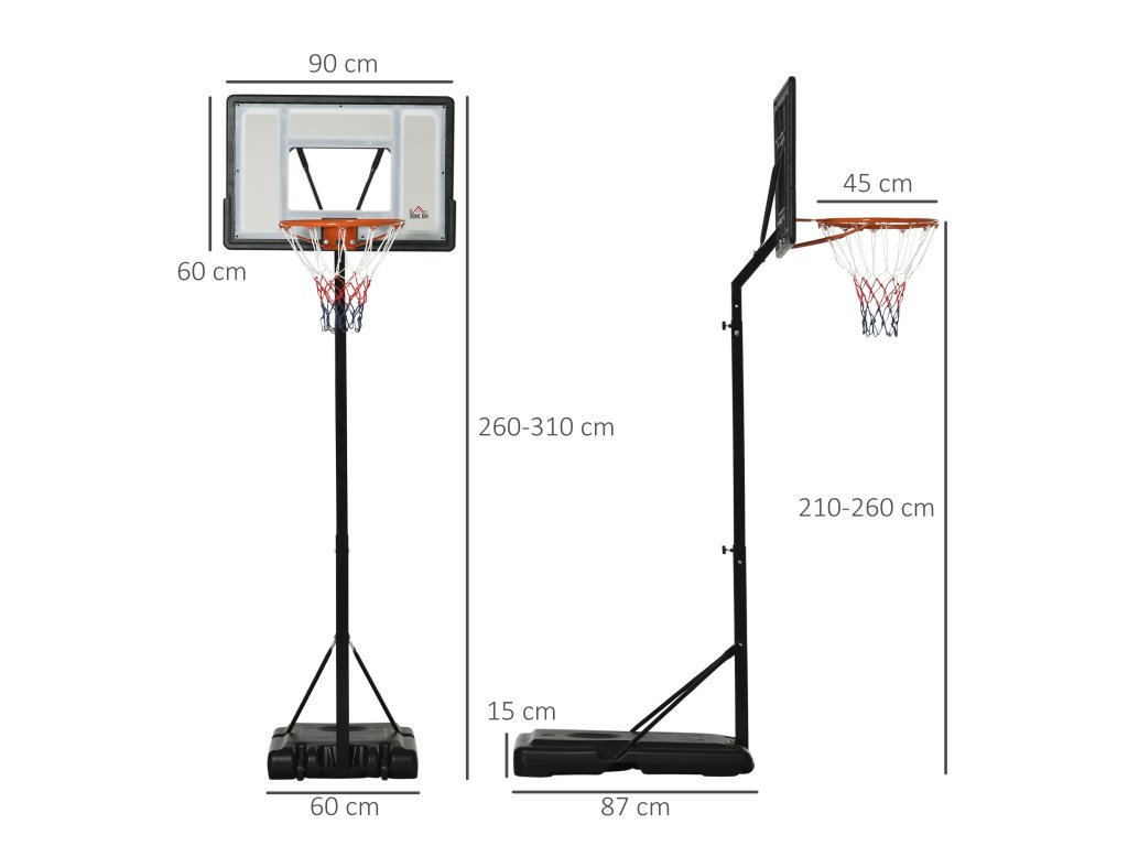 - ÚDAJE O VÝROBKU: Celkové rozměry: 90 Š x 60 H x 260-310 V cm, výška basketbalového koše: 210-260 cm, rozměry základny: 87 D x 60 Š x 15 V cm. Montáž je nutná