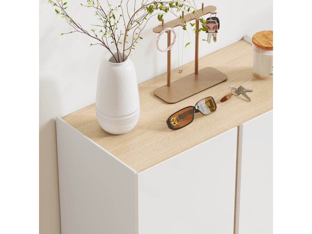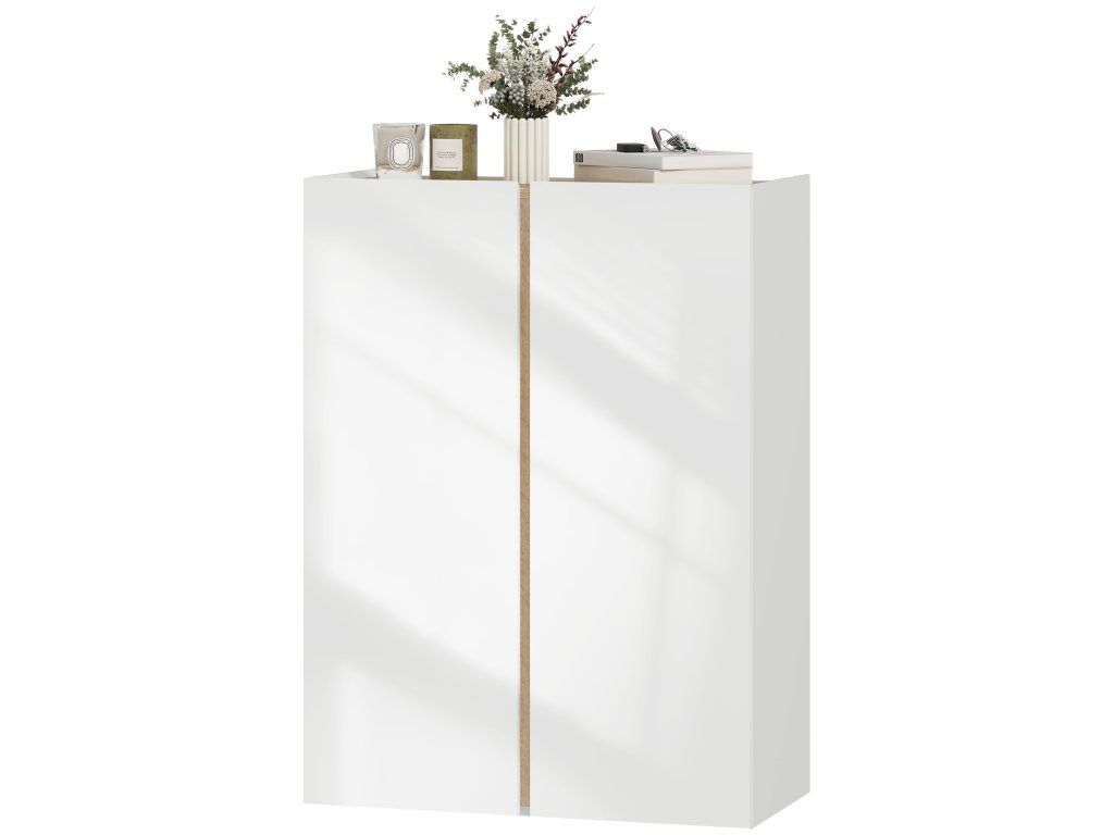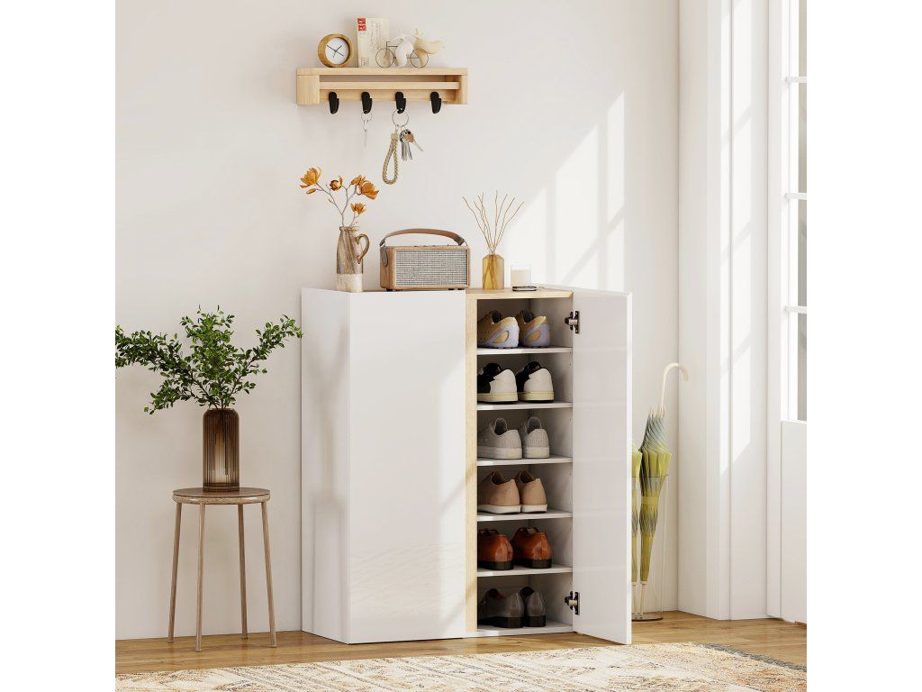 - Moderní estetika: Tato skříňka na boty s lesklými bílými dvířky a teplým dřevěným povrchem kombinuje čisté linie a jemné barevné tóny. Vytváří minimalistický styl, který vylepší každou předsíň nebo vstupní prostor