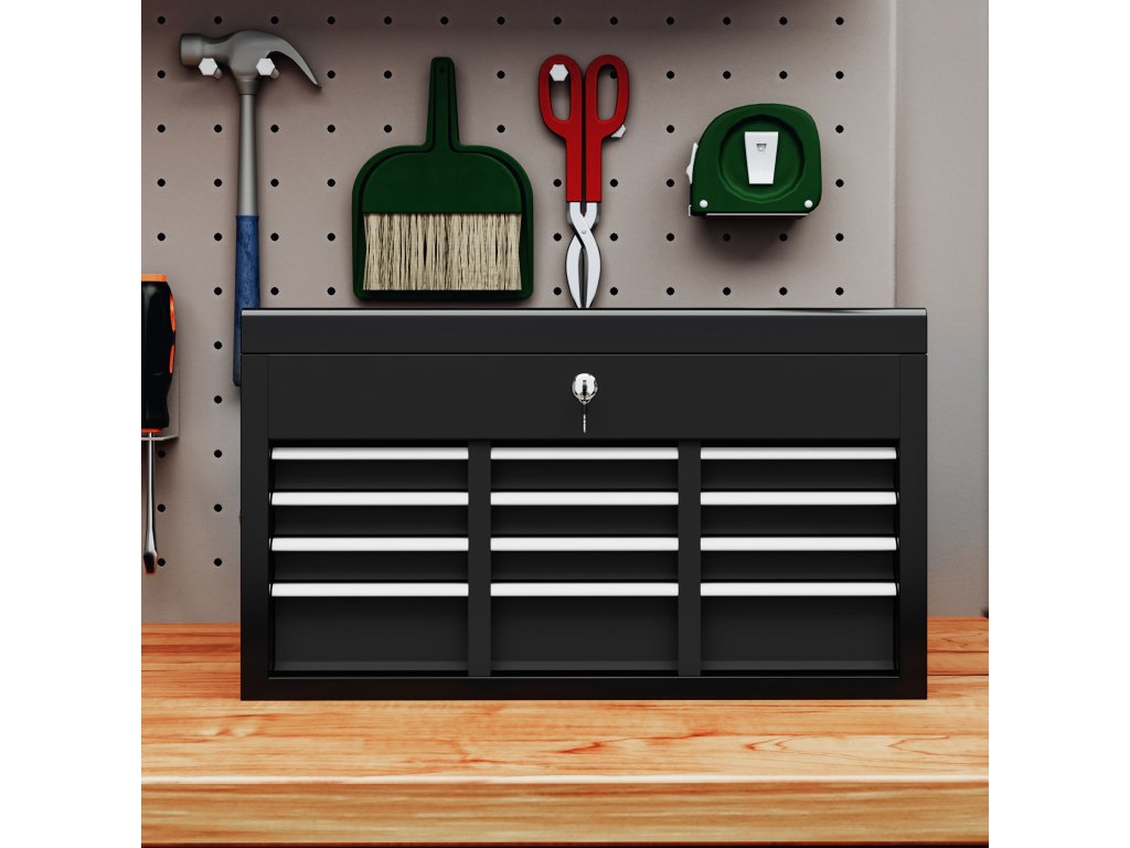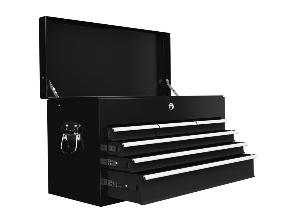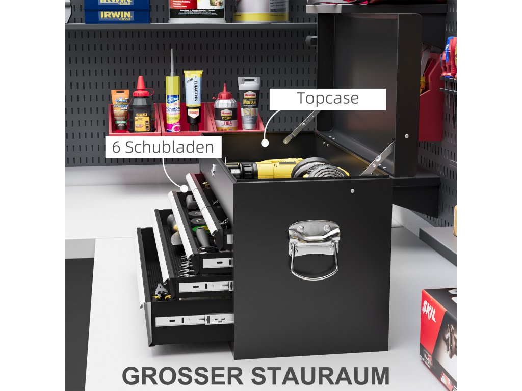 - Pevné úložné řešení: Tento box na nářadí má šest výsuvných zásuvek a horní úložný prostor, ve kterém můžete přehledně a na dosah uložit různé nářadí. Díky kuličkovým pojezdům zásuvek se zásuvky hladce otevírají a zavírají
