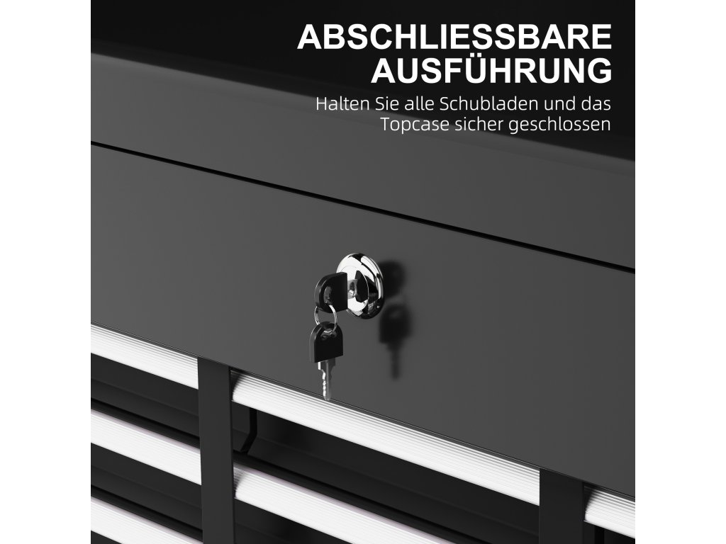 - ✔ Všechny úložné prostory jsou uzamykatelné, aby bylo nářadí v bezpečí, dva klíče jsou součástí balení