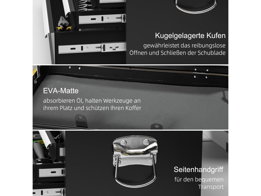 - ✔ Vnitřní podložky EVA absorbují olej a udržují kufr na nářadí na místě