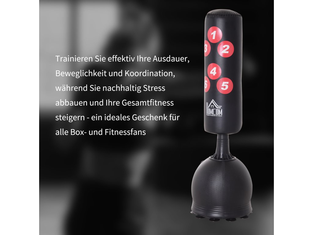 S kvalitním boxovacím pytlem na stoje od společnosti HOMCOM můžete cíleně a úspěšně trénovat z domova. Pevná plastová základna, kterou lze naplnit vodou nebo jemným pískem, zajišťuje bezpečnou oporu. Přísavky na spodní straně zajišťují ještě lepší přilnavost. Dopadová plocha je odolná a polstrovaná. Díky systému FLEX tlumí boxovací pytel kopy a údery, aniž by způsobil zranění. Číslování na povrchu vám také umožní trénovat háky, údery a kopy s přesností na míru. Montáž a plnění jsou rychlé a snadné, takže začátečníci i pokročilí boxeři mohou ihned začít s tréninkem boxu.
