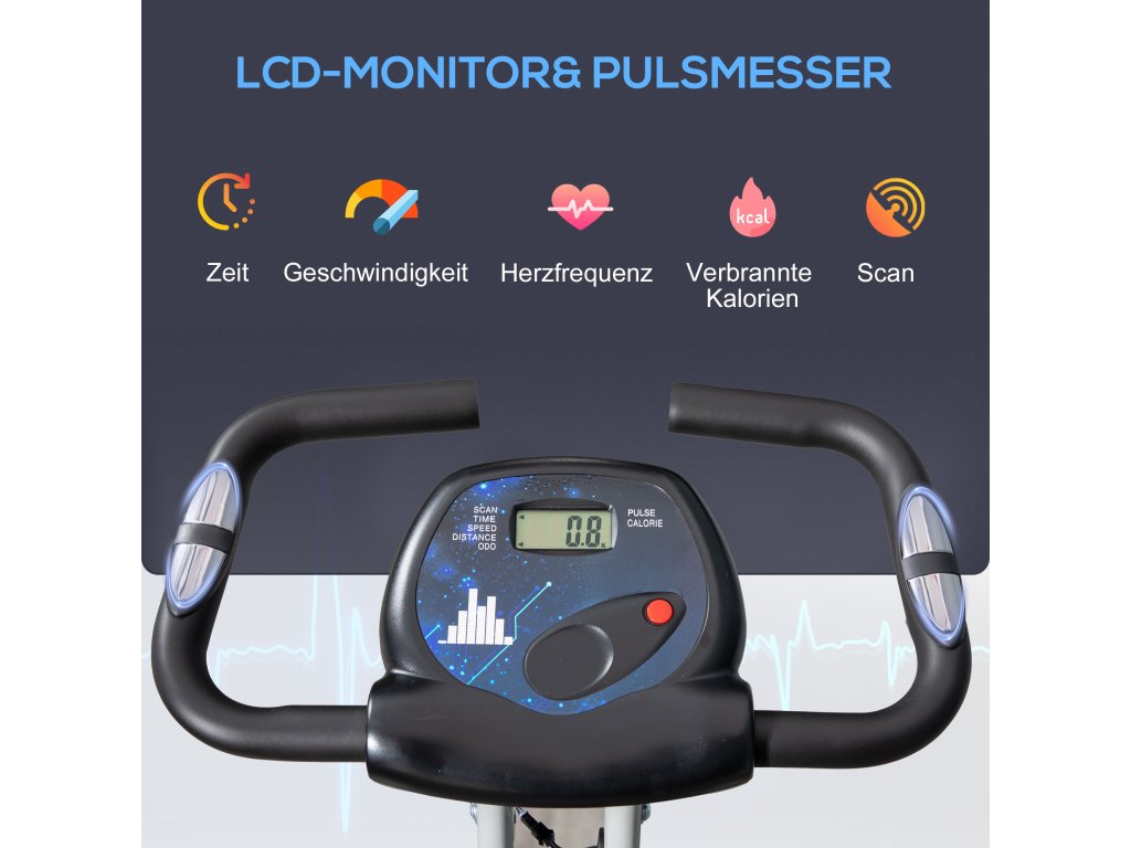 - Profesionální funkce: Nastavitelné sedadlo v 5 úrovních a přizpůsobitelná opěrka zad vám pomohou rychle najít optimální polohu sezení. 8 úrovní odporu šlapání vám pomůže vytvořit trvale zdravou tréninkovou rutinu. Přehledný LCD displej vám zobrazuje aktuální parametry: Skenování, čas, rychlost, vzdálenost, kalorie, celkový počet ujetých kilometrů, srdeční tep.