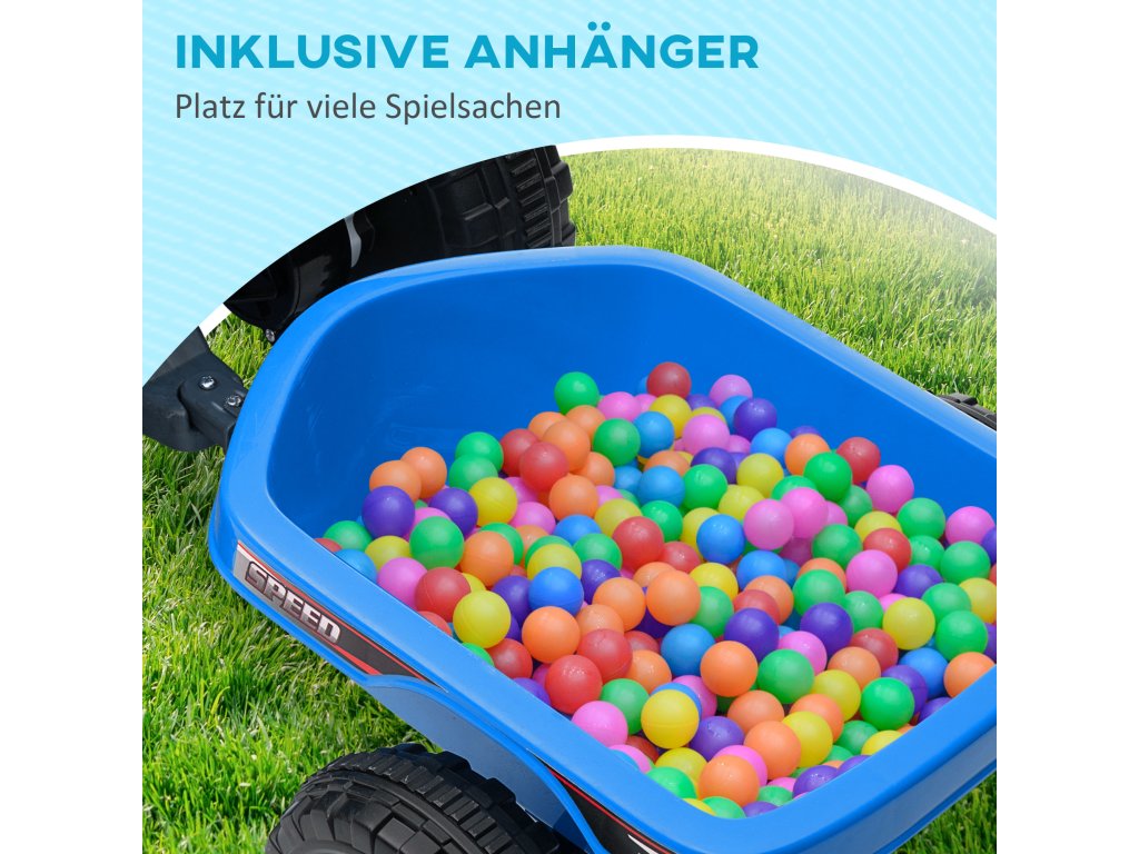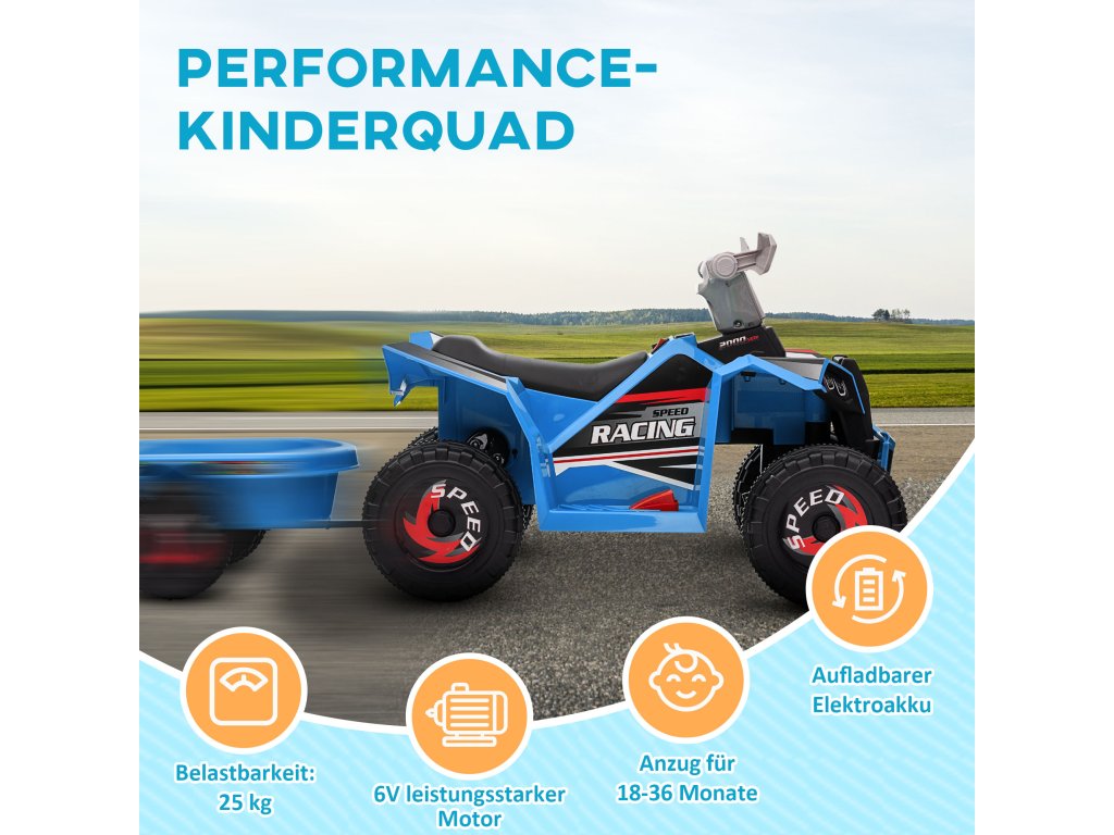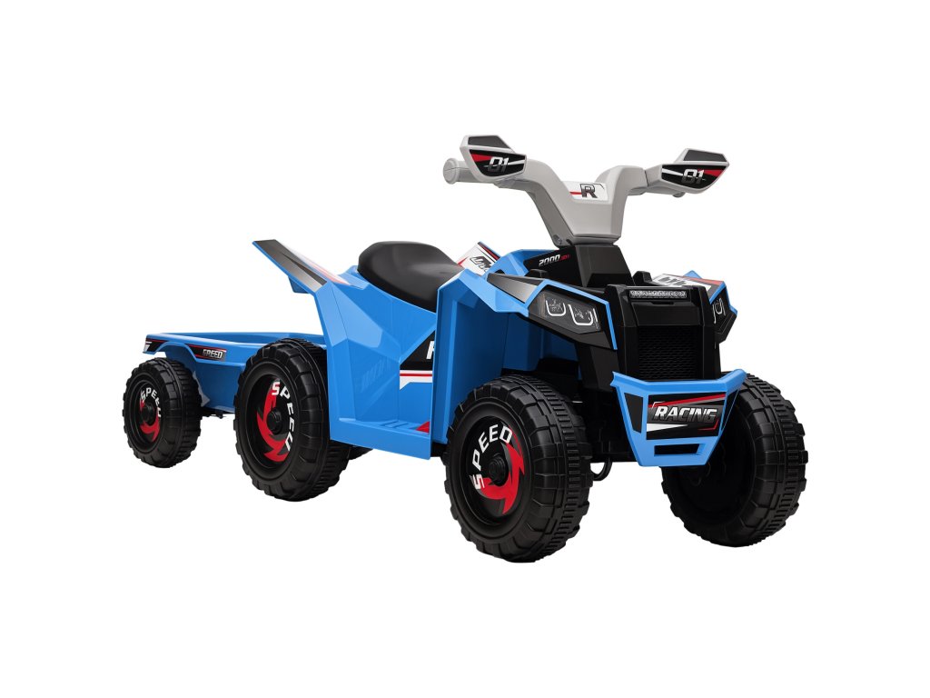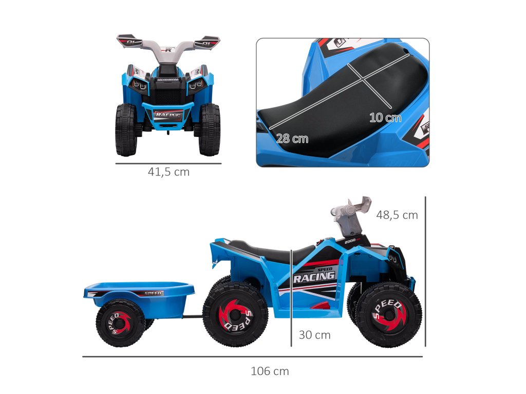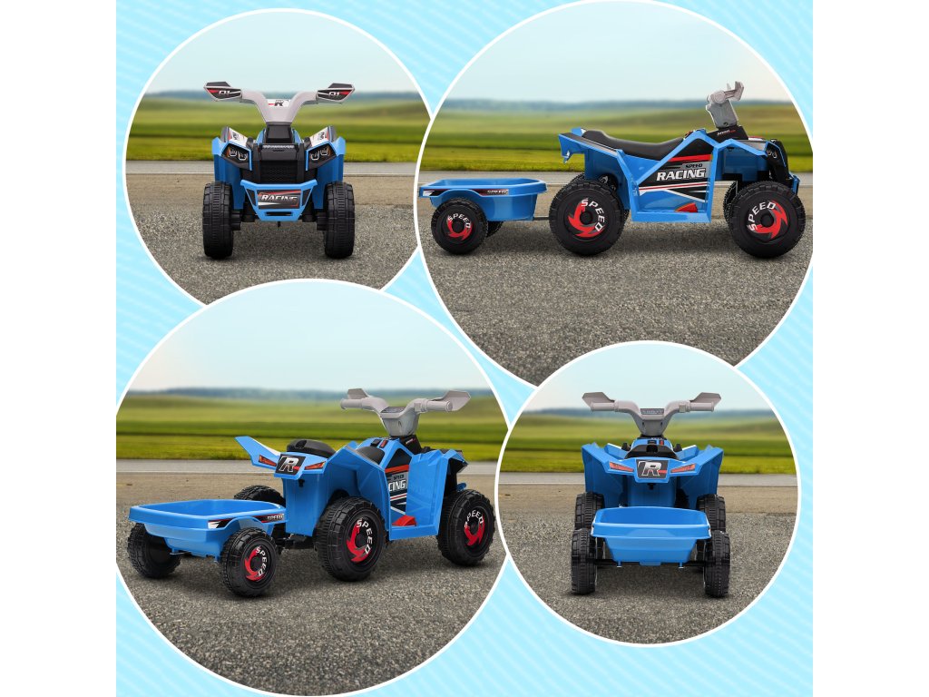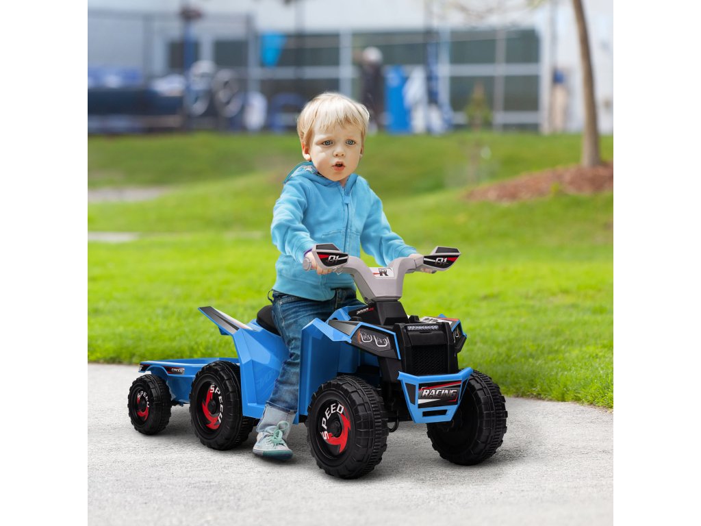 HOMCOM Dětská čtyřkolka, dobíjecí, 2,5 km/h, s přívěsem, doba jízdy 50 min, pro děti od 1,5 do 3 let, modrá